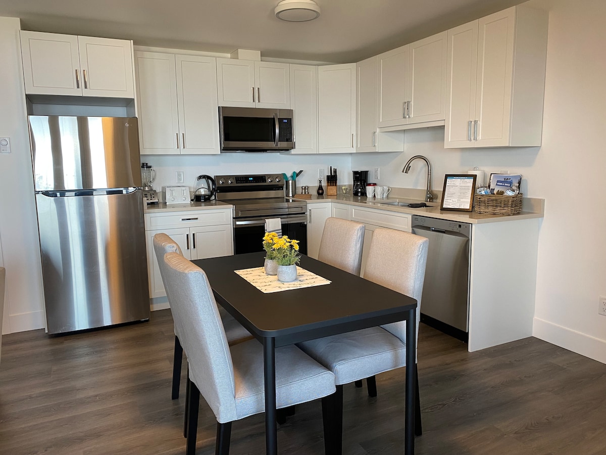 Nossa suíte é um impressionante retiro de um quarto recém-construído, com um teto de 9' e um espaço generoso de 810 SF. Possui uma Smart TV de 58 polegadas e uma cozinha totalmente equipada, garantindo um estilo de vida de alta qualidade durante suas viagens. Delicie-se com o nascer e o pôr do sol de tirar o fôlego da sua varanda privada, com uma vista magnífica para o oceano e as montanhas através do Estreito da Geórgia. Convenientemente localizada, nossa suíte é uma base ideal para descobrir o fascínio da Ilha de Vancouver.