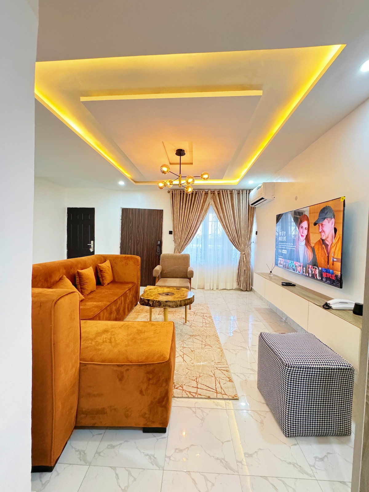 Apartamento elegante de 2 quartos com uma televisão inteligente de 65 polegadas, Netflix, acesso Wi-Fi gratuito e um mini bar de vinhos. Desfrute de dois quartos confortáveis, uma kitchenette com micro-ondas, frigorífico, fogão a gás e máquina de lavar roupa de 9 kg. Localizado na segura Gaduwa Estate, a poucos minutos do Gaduwa Shopping Plaza, lojas e cafés. Perfeita para estadias de negócios ou lazer, esta casa acolhedora combina conforto, conveniência e um ambiente tranquilo para uma experiência relaxante em Abuja. Estamos ansiosos por recebê-lo. 😊