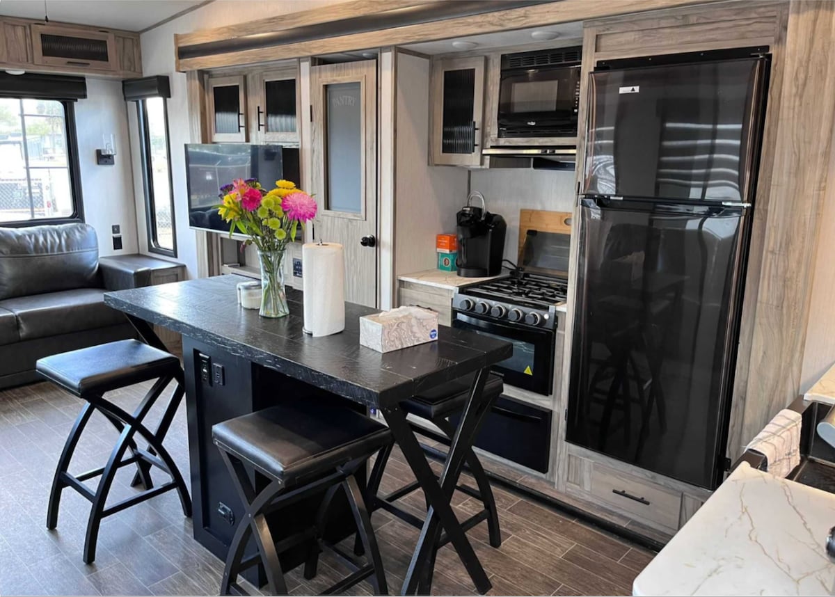 Prepare-se para se mimar. Ele dorme 8. É o Glamper para a sua família grande, ou convide a sua família alargada! A cozinha possui uma ilha de pia virada para a porta, lareira e iluminação ambiente azul. Esta caravana de viagens tem uma despensa e beliches queen-size! O sofá fica perto de uma grande televisão de ecrã plano e a mesa de jantar transforma-se em camas adicionais. Pais, desfrutem do quarto separado do resto com espelhos, espaço no armário e uma cama queen-size atualizada com espuma de memória.