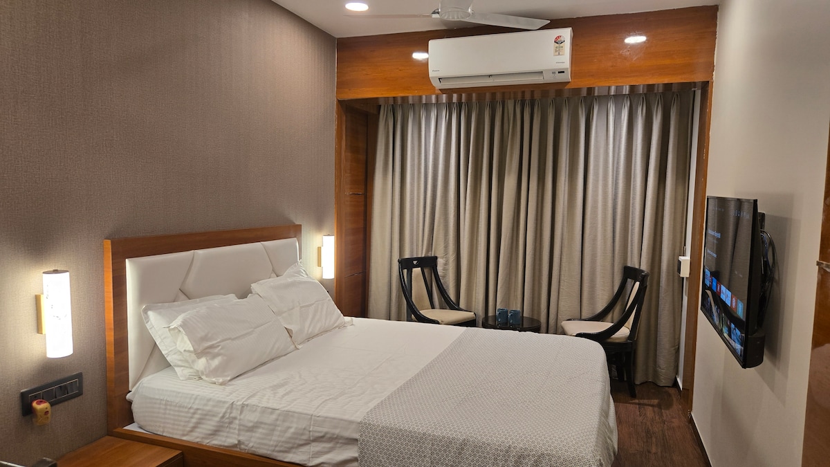 Damos-lhe as boas-vindas ao nosso estúdio com tema londrino em Hiranandani Estate, Thane, onde o charme britânico encontra o conforto moderno. Desfrute de uma cama macia, sofá-cama, Smart TV, Wi-Fi, cozinha completa, máquina de lavar roupa e limpeza diária. Inclui produtos de higiene pessoal, toalhas lavadas a vapor e segurança 24 horas por dia, 7 dias por semana. A poucos minutos de cafés, restaurantes e "The Walk". Ideal para trabalho, estadias médicas ou uma escapadela relaxante.