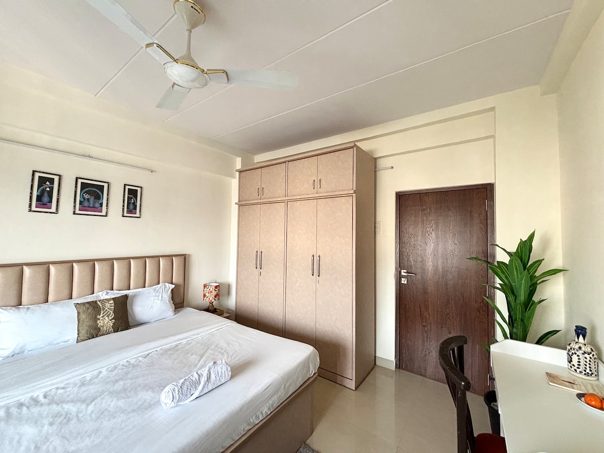 Fique no luxo no nosso apartamento 1BHK totalmente mobilado, oferecendo um quarto acolhedor, duas casas de banho (um quarto anexo, um comum ) e uma cozinha totalmente funcional com eletrodomésticos e utensílios de cozinha básicos. Relaxe na espaçosa sala de estar com uma grande televisão inteligente e um design de interiores elegante. Desfrute de mobiliário de alta qualidade que criam uma casa longe de casa. Perfeito para estadias curtas e longas, este apartamento promete conforto e conveniência numa localização privilegiada da cidade. Reserve agora para uma estadia excecional!