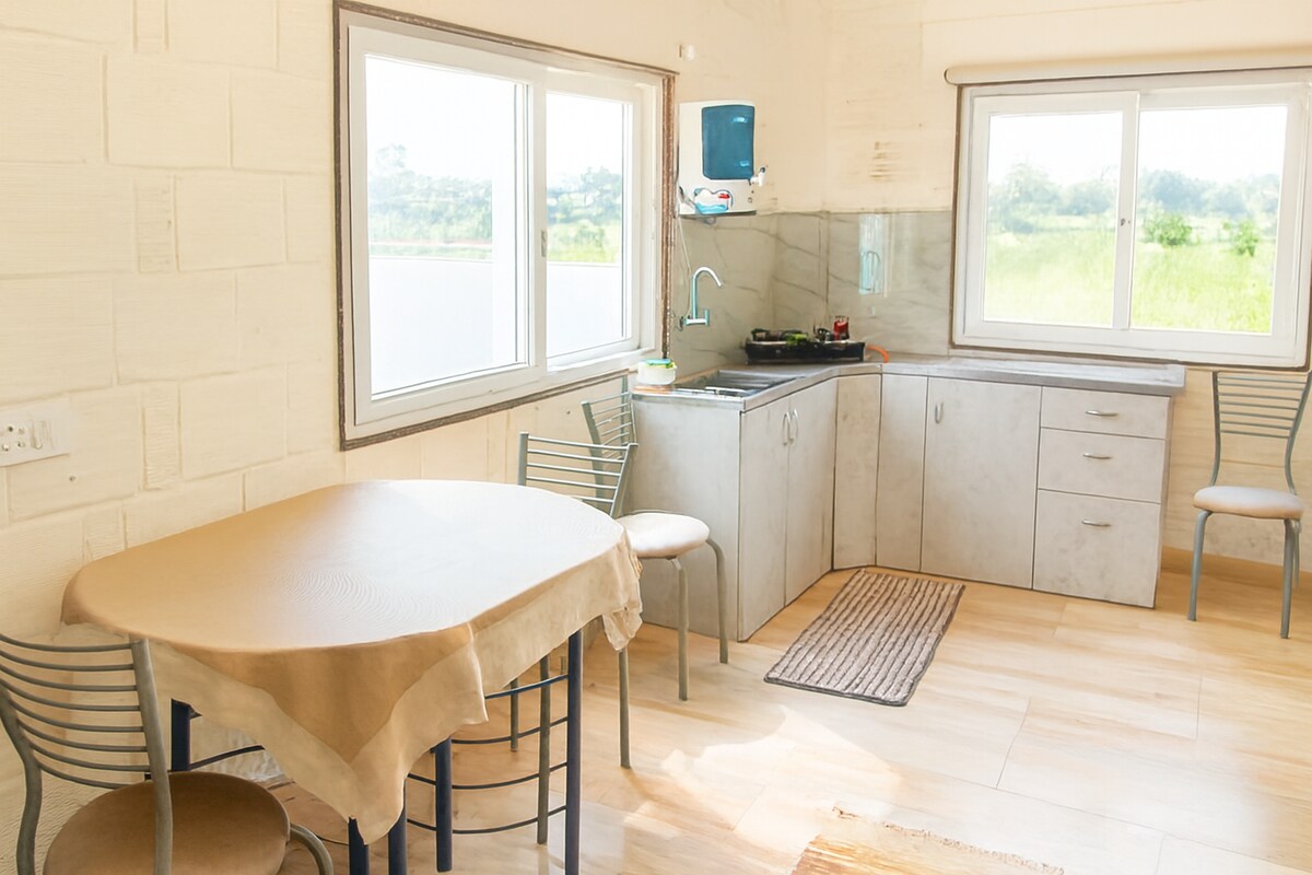 Escape to nature at our couple-friendly farmhouse! 🌿 Enjoy peace, privacy, and hill views that look even better than the photos. Wake up to birdsong, cool breezes, and relax on two cozy swings. The kitchen is fully equipped with masalas, RO water, fridge, and mixer and also a there's bicycle for you— perfect for long stays. Cook your own meals or visit nearby spots like Bapu Ki Kutiya, Vishnu Restaurant, Basil ,one malt or Sakshi Dhaba. A serene retreat for couples and friends alike. 💚