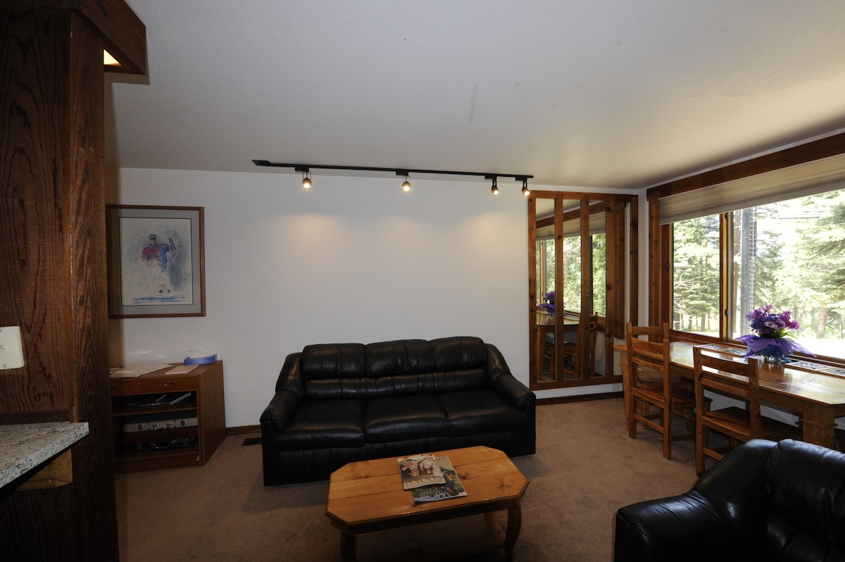 Fique no Vale Olímpico, a poucos minutos de Palisades Tahoe. Desfrute do nosso espaçoso apartamento de 2 quartos e 2 banheiros bem equipado com piscina maravilhosa, banheira de hidromassagem, sauna e quadras de tênis. Deixe seu carro na garagem e aproveite o après-ski usando o aplicativo Mountaineer para viajar pela Olympic Valley. No verão, use o aplicativo Tart Connect para ir para Tahoe City e além. Perto da loja de conveniência 7-11 e aluguel de bicicletas. Wi-Fi de alta velocidade para trabalho e lazer. Carrinho de bebê, cercadinho disponível.