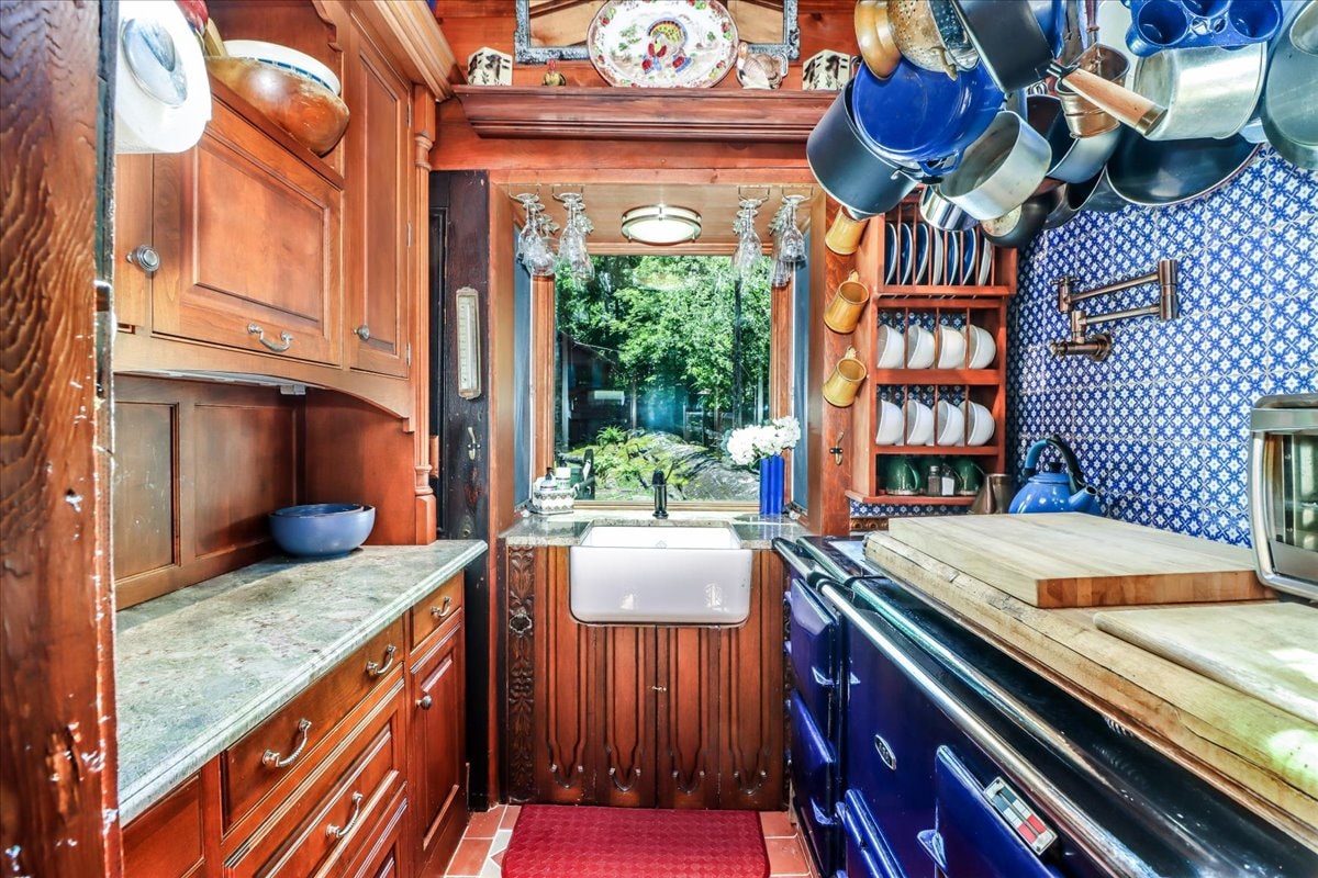 Estiloso e cênico: cozinha de chef, banheira de hidromassagem