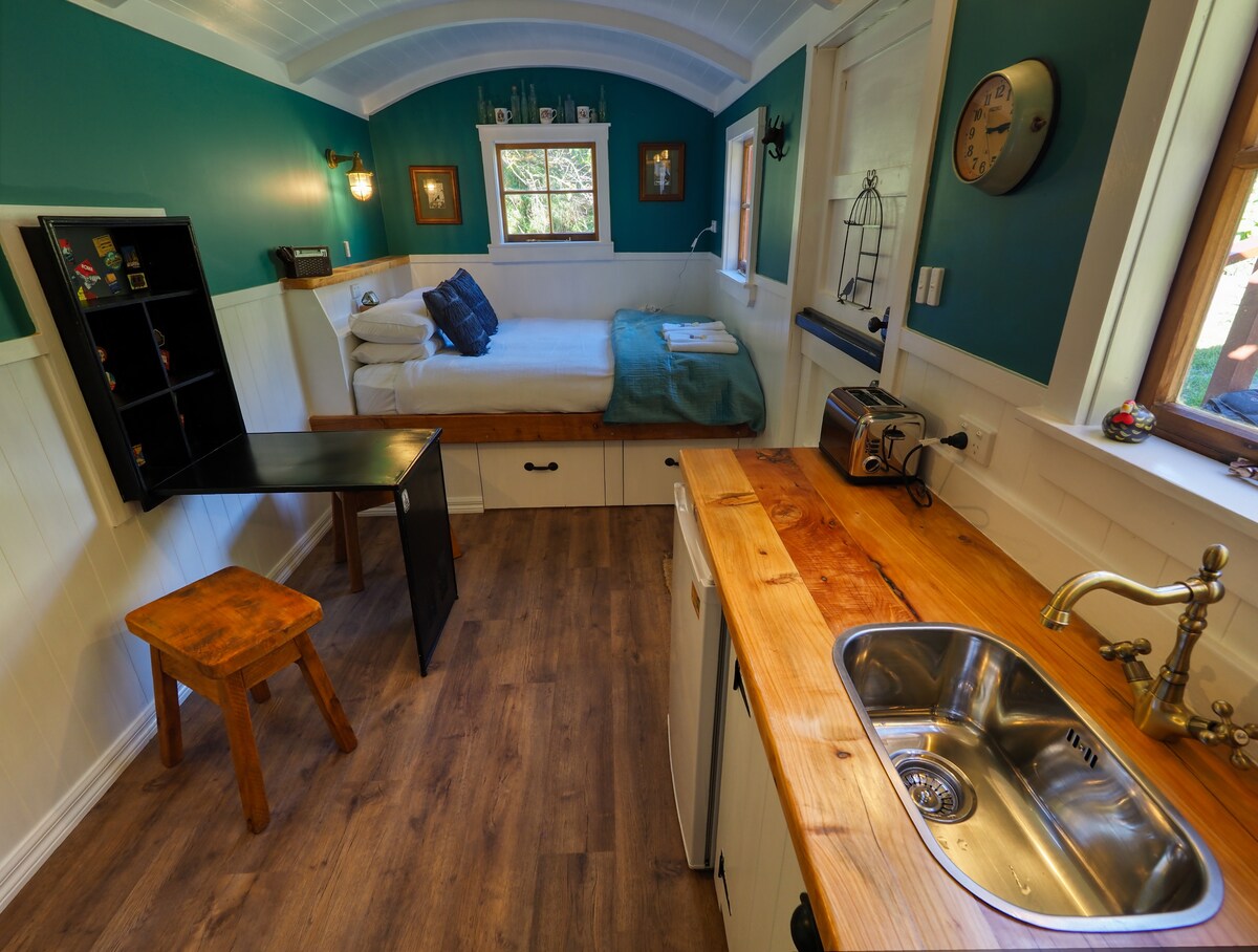 Hospede-se em um Housetruck construído com materiais reciclados/reutilizados na traseira de um Mack Truck. Uma cama Queen no loft da frente e uma cama de solteiro nos fundos. O Housetruck tem instalações básicas de cozinha. Jarro, torradeira, geladeira e micro-ondas. Um chuveiro dentro do caminhão, ele funciona a partir de um califont, por isso é definido para uma temperatura usando uma torneira. Por favor, note que o banheiro está localizado em um edifício separado a cerca de dez passos de distância, juntamente com a máquina de lavar roupa. Você tem acesso privado ilimitado a estes.