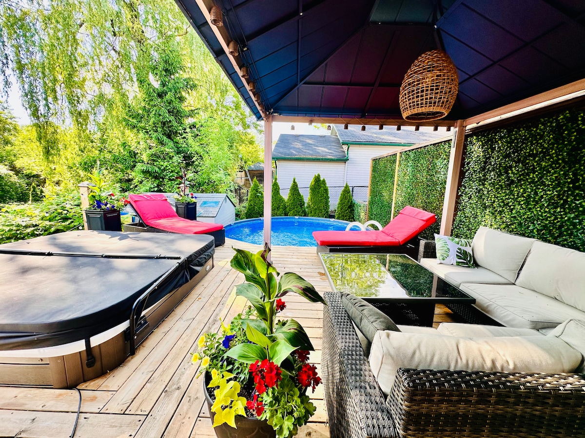 *Redução de preço especial (quase 50%, a partir de 12 de setembro) para celebrar a temporada de outono.* Bem-vindo à minha moradia no Niágara.(Licença B&B facility) Esta moradia de luxo oferece uma decoração espetacular, oásis privado no quintal, pequeno-almoço gratuito. A unidade de hóspedes tem entrada privada, 2 quartos, 2 casas de banho (1 com luz do céu), cozinha completa, sala de jantar e sala de estar com TV, sofá-cama. Apenas os hóspedes estão a usar o quintal privado com banheira de hidromassagem (funciona o ano inteiro), piscina infantil (aberta apenas no verão) Observação: o anfitrião está a viver na unidade separada.