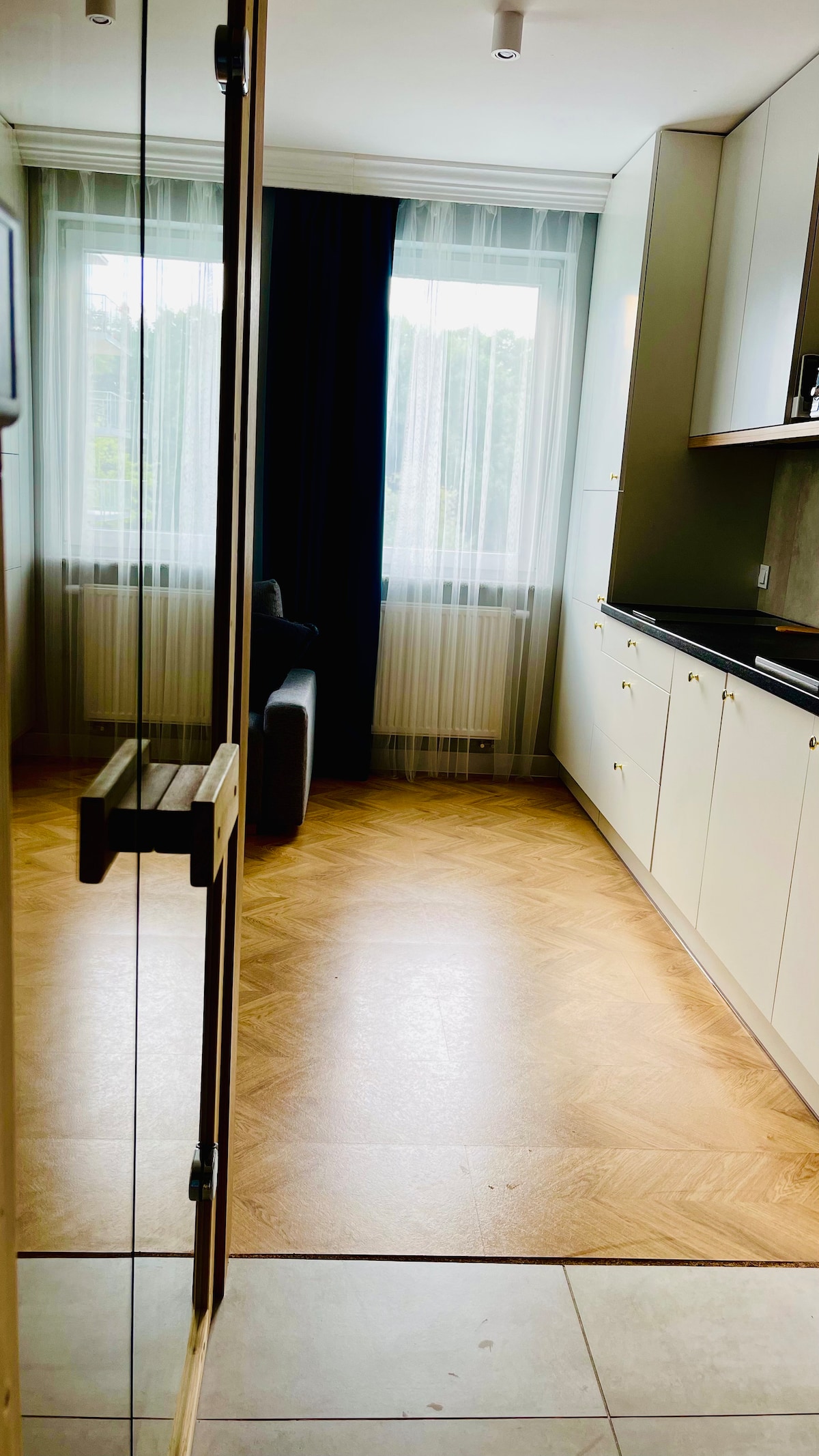 Apartamento com sauna finlandesa privativa, varanda. Luminoso, lindamente acabado! Tem um quarto separado com uma cama grande e confortável, um guarda-roupa e uma televisão. Na sala de estar, um confortável sofá-cama grande, mesa. A cozinha está equipada com: máquina de lavar louça, micro-ondas, placa de indução, pia, chaleira elétrica, cafeteira de pressão com moedor, torradeira, louça e talheres. No banheiro: chuveiro, máquina de lavar. No corredor: um grande guarda-roupa e um menor para casacos.