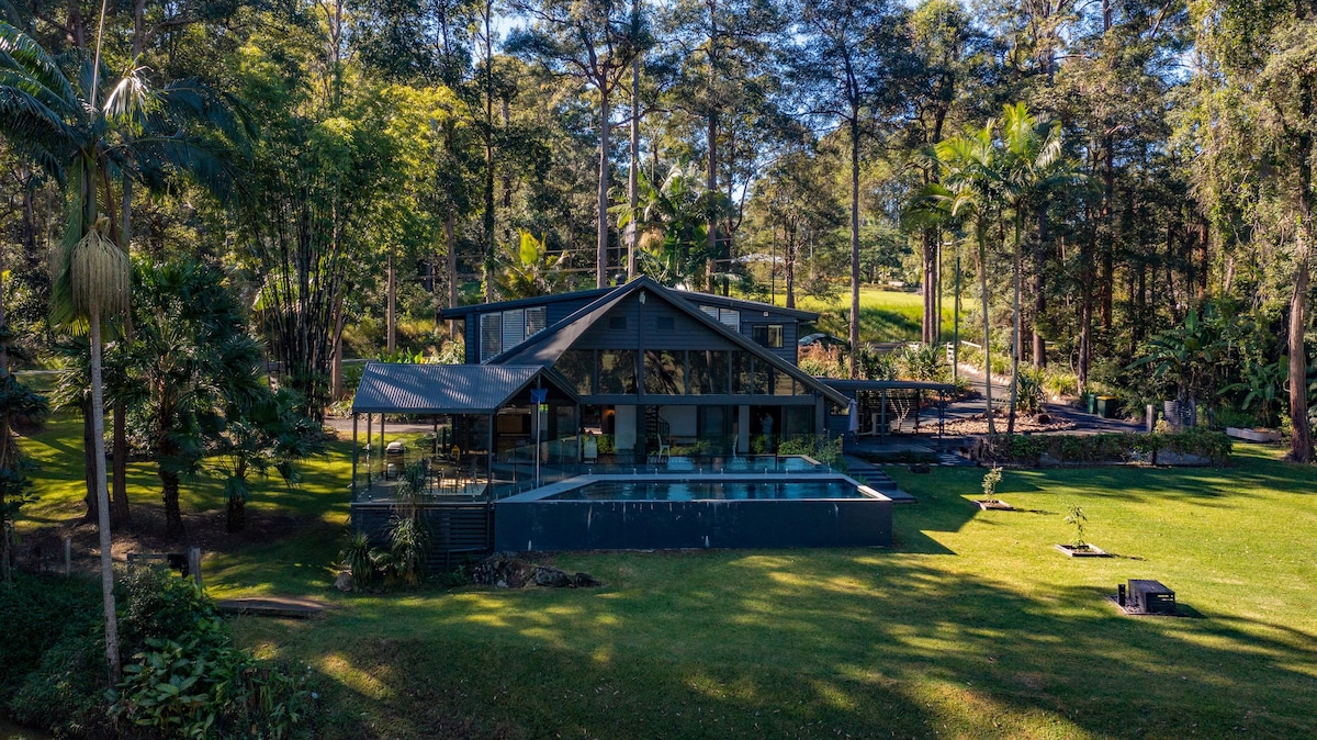 Bem-vindo ao Wren's Nest: A Serene 5-Bedroom Retreat in the Sunshine Coast Hinterland. Fuja para o Wren's Nest, um refúgio privado deslumbrante situado no topo da encosta, oferecendo o cenário perfeito para se reconectar com amigos e familiares. Esta casa de 5 quartos oferece uma escapadela tranquila no campo, com vistas deslumbrantes e confortos modernos. • Piscina infinita e deck expansivo: descontraia junto à cintilante piscina infinita, relaxe no espaçoso deck enquanto desfruta de espetaculares entardeceres e luzes cintilantes de Yandina.