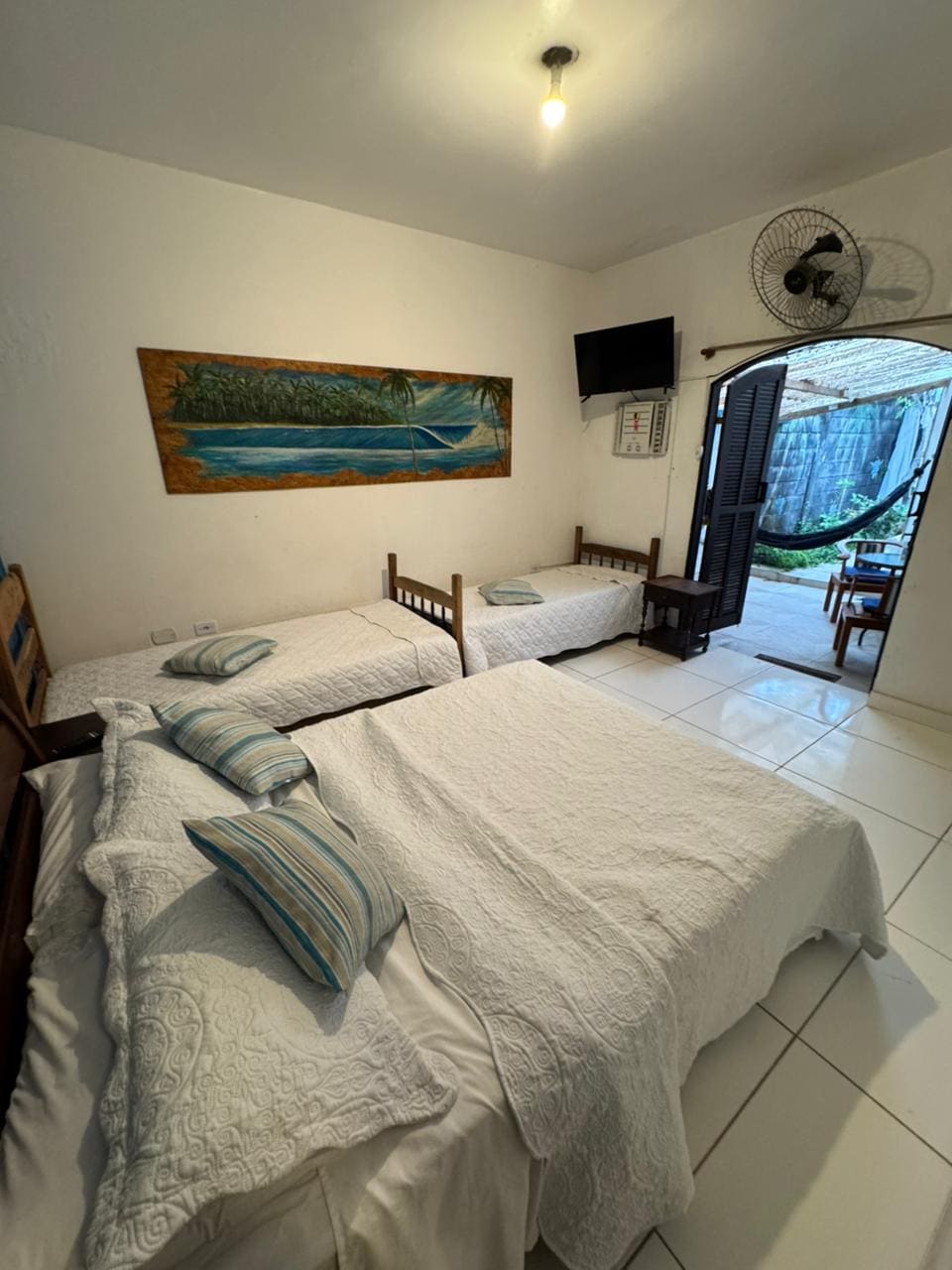 ✔ Suíte dentro de pousada em Itaipuaçu ✔ Capacidade para até 5 pessoas ✔ Ar-condicionado e ventilador ✔ TV Smart e frigobar ✔ Varanda com rede ✔ Pia de apoio ✔ Ambiente confortável e funcional