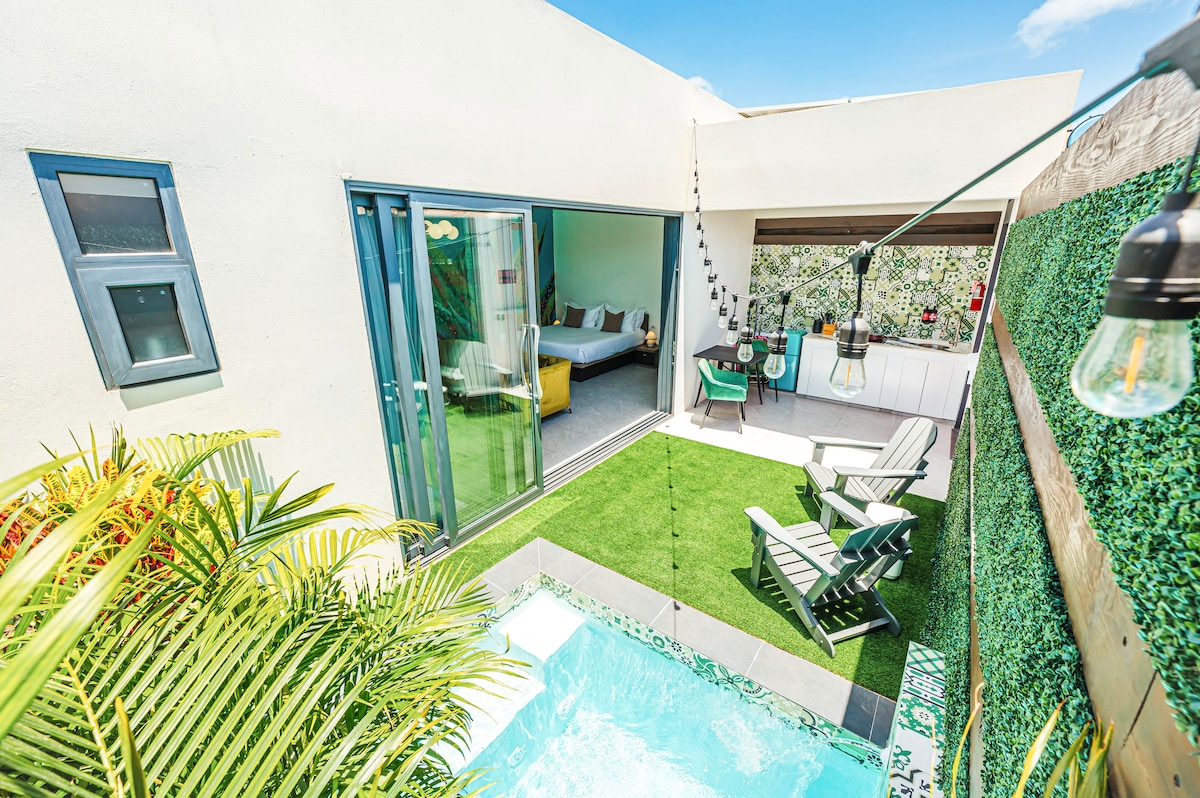 O seu próprio estúdio privado num refúgio boutique apenas para adultos, concebido para conforto e isolamento. Cada espaço dispõe de uma piscina de mergulho privada, jardim exuberante, cozinha totalmente equipada, cama king-size com roupa de cama premium, casa de banho elegante com chuveiro quente e uma espaçosa área de estar com uma televisão HD de 65". Um guia de Aruba selecionado e serviços de hóspedes atenciosos completam a sua estadia. Acolhe 3 hóspedes por estúdio.