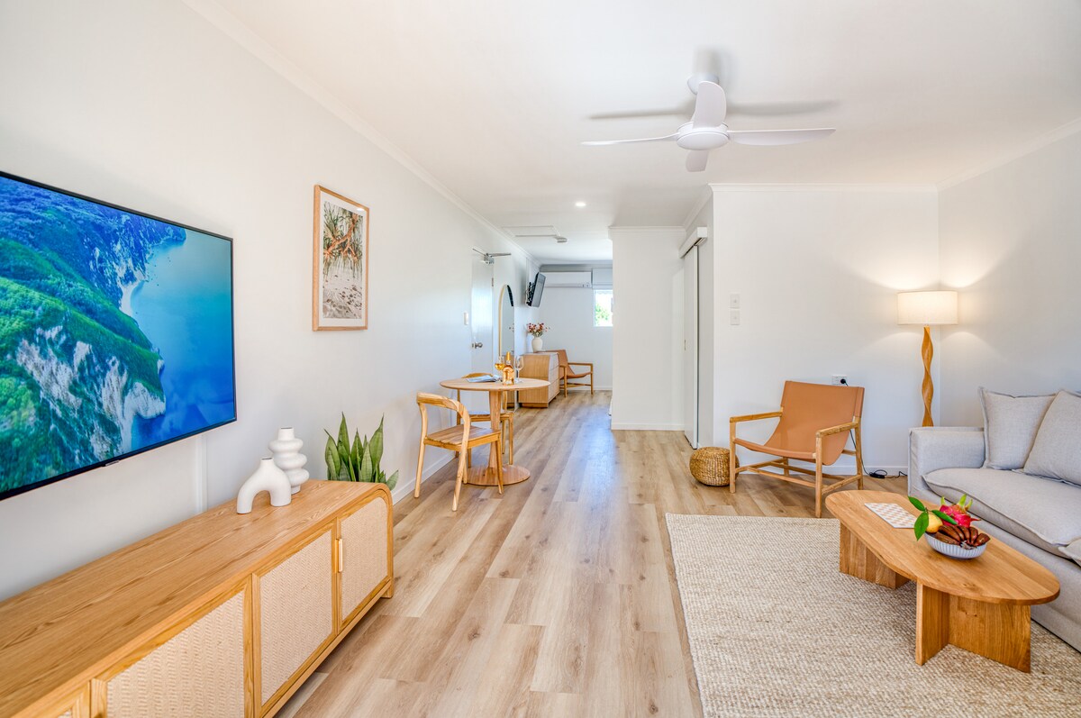 ** Se estiver a alugar um fim de semana em fevereiro, consulte a nota abaixo sobre a renovação da piscina do resort ** Situado nos idílicos Noosa Heads, este refúgio costeiro é um retiro perfeito para casais. A 550 metros a pé da colina até à icónica rua Hastings e ao Parque Nacional de Noosa e ao recinto da Praia Principal de Noosa através de um trilho. A área é um parque de diversões para surf, caminhadas e amantes do ar livre. Surf, areia, comida e terapia de compras, tudo a poucos minutos a pé da porta do apartamento.