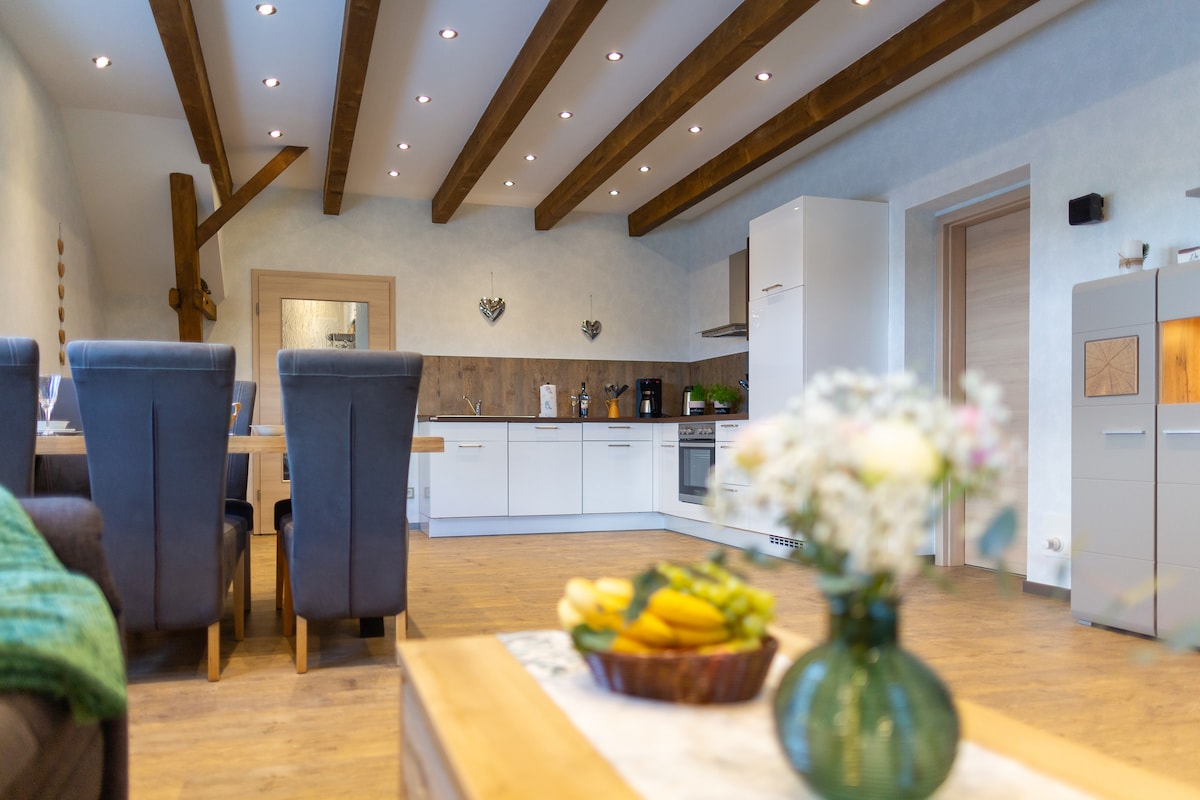 Sente-se e relaxe – neste alojamento tranquilo e elegante. Recém-reformado e completamente redecorado, o "Haselnuss" convida você a relaxar. Para as suas férias - se necessário com trabalho de escritório - super adequado. Nossa casa de madeira histórica foi construída há mais de 200 anos e foi recentemente reformada. O "Haselnuss" está localizado no térreo da casa e tem cerca de 50 metros quadrados. O grande jardim permite recarregar as baterias ou desabafar. Acesso direto ao terraço.