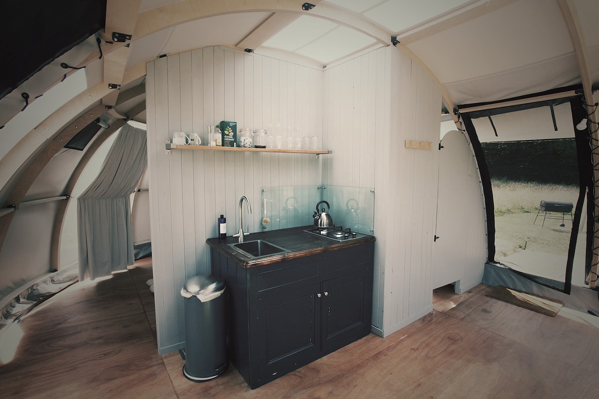 Acomoda até 6 pessoas: um conjunto de beliches duplo mais 2. Banheiro com chuveiro, pia e vaso sanitário com descarga. A área da cozinha tem uma pia com fogão a gás, talheres, utensílios e louças fornecidos. Rede de água quente e fria e eletricidade. Queimador de lenha, com uma gaiola de segurança para crianças. A tenda está mobiliada com confortos domésticos, incluindo cadeira de balanço e rede, um pequeno sistema de música, livros e jogos para mantê-lo ocupado. Exterior: lareira com assentos, torneira de água, rede de badminton e um balanço de pneu.
