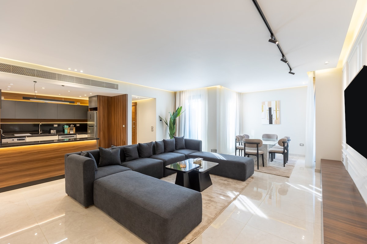 Estadia elevada no Novo Cairo! O apartamento elegante fica acima do Park Mall, dentro do complexo seguro de Nyoum (Porto). Desfrute de uma localização privilegiada, vistas panorâmicas e uma estadia tranquila. Por que vai adorar: • Jante, relaxe, faça compras, divirta-se e compre mantimentos — tudo sem sair da região. •Acima do hipermercado Lulu, cafés, restaurantes e lojas de retalho •Desfrute de acesso a 2 piscinas e a um campo de futebol. •Caminhada até aos centros comerciais American Plaza, Maxim e Point90 • Ginásio inteligente e lavandaria no piso inferior • Estacionamento subterrâneo conveniente • Aeroporto do Cairo ~20 min.