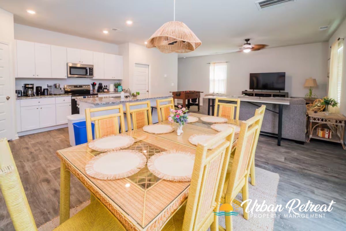 HDTV de🍿 85", assentos de teatro + iluminação de néon. Filmes ou desportos incríveis. 🏡🏡 2 casas separadas (ambas são todas suas). Perfeito para mais de 2 famílias ou grupos grandes. A 🌊 3 quarteirões da praia com acesso público no final da nossa rua! 4 cadeiras de praia + carrinho de praia grande incluídos. 💥 Remodelação concluída em abril de 2025 e novos eletrodomésticos também! Piscina 🌞 incrível com fontes, iluminação personalizada e novo hardscaping com espreguiçadeiras à volta da piscina! 🛌 Acomoda 14 pessoas facilmente e confortavelmente. 🍽️ - Jantar temático boho com mesa grande para grupos grandes.