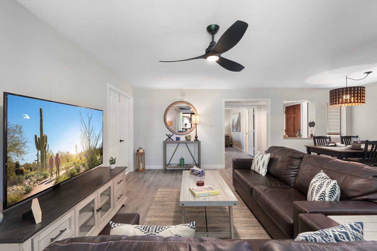ENCONTREI! Um espaçoso retiro em Scottsdale, com 2 camas e 2 casas de banho, com comodidades modernas e uma atmosfera relaxante. Perfeitamente localizado no procurado McCormick Ranch. 🏜️ Desfrute de *3 piscinas cintilantes*, *cama king*, *banheira de hidromassagem*, *sauna*, *campos de pickleball e ténis*, *ginásio* e acesso direto ao caminho de 10 milhas de Greenbelt. No interior temos uma Smart TV de 50 polegadas, café, *máquina de lavar e secar roupa na suite*, o sofá mais confortável e estacionamento coberto! Localizado em McCormick Ranch, perto de TopGolf, Old Town, lojas, restaurantes e trilhos.