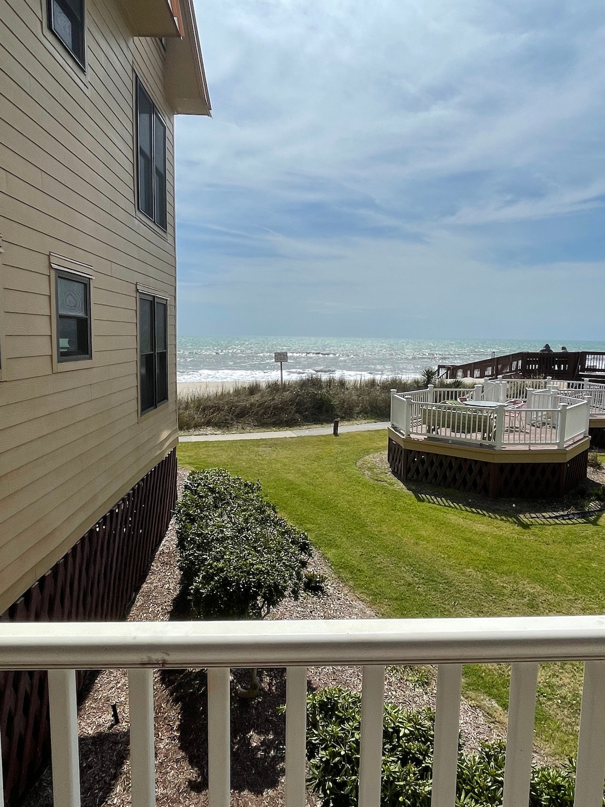 Veja-se aqui. 34.4902N de longitude, 77.4136W de latitude. Vista encantadora para o mar da cozinha, sala de estar e varanda. Novo apartamento renovado com 1 cama/1 banheiro à beira-mar. Acomoda 5 pessoas (1 cama queen, 1 beliche (ótimo para crianças) Sofá com cama dupla. TV a cabo básica TV smart de tela plana de 50 polegadas Roupa de cama e toalhas fornecidas Cozinha completa - Por favor, limpe e guarde panelas e frigideiras na partida Banheiro completo Máquina de lavar/secar no local Churrasqueiras no local Acesso à praia Horário do check-in: 15h Check-out: 12h