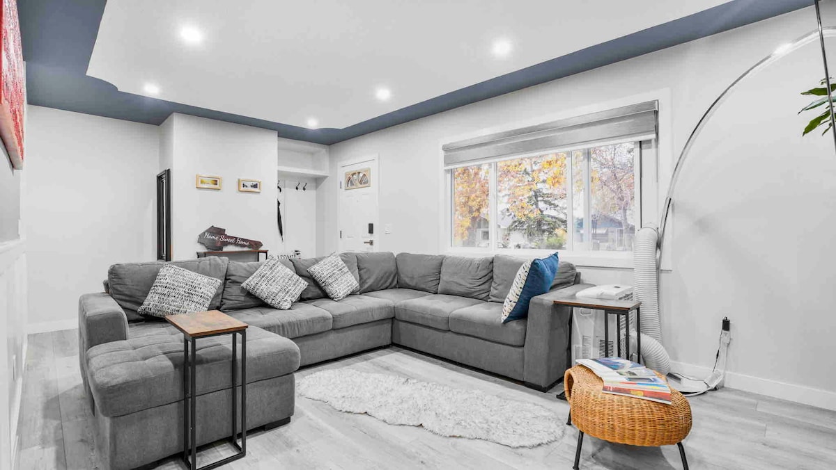 Welcome to our stylish 2-bedroom basement suite, where comfort meets entertainment! Nestled in a vibrant neighborhood, our modern retreat boasts two cozy bedrooms, each featuring plush bedding for a restful night's sleep. Need extra space? No worries – we've got you covered with an extra sofa that easily accommodate additional guests. • 7 MIN YYC AIRPORT • 5 MIN CTRAIN • 12 MIN CROSSIRON MALL • 20 MIN DOWNTOWN • 90 MIN BANFF