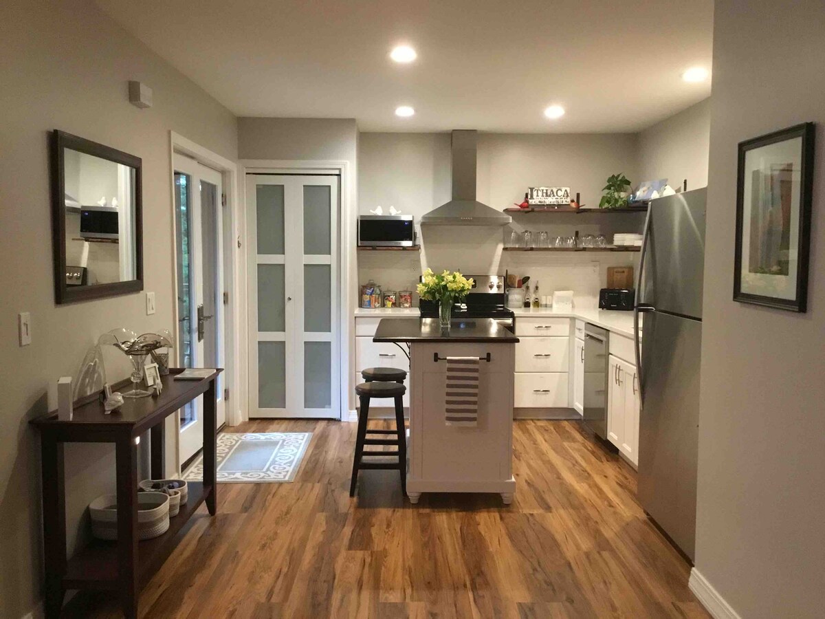 Bem-vindo a "gargantas" Ithaca, e nosso recém-reformado apartamento de nível inferior na comunidade do Nordeste de Ithaca! Nosso apartamento limpo e projetado de forma simples é um lugar com localização central para ficar enquanto você explora tudo o que Ithaca tem a oferecer enquanto visita por prazer ou a negócios. O apartamento de um quarto tem um colchão queen size confortável de espuma de memória. Nossa cozinha de conceito aberto com uma ilha está equipada com o básico para suas necessidades culinárias após uma viagem ao Mercado dos Agricultores para produtos frescos.