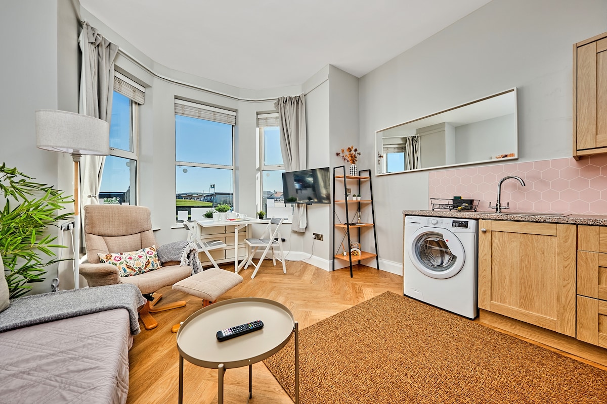 Escape to our serene penthouse in the heart of Portrush, just steps away from the famous harbour and beautiful beaches. This stylish 1-bedroom apartment features a sofa bed, comfortably accommodating up to 3 guests. It's the ideal base for exploring the breathtaking Causeway Coast. Enjoy modern amenities, elegant furnishings, and immediate access to the beach for a relaxing coastal getaway.