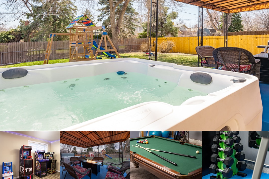 Cozy lower-level unit with 2 bedrooms (King & Queen), full bath with walk-in shower and double sinks, sectional couch, renovated kitchen, TVs in living room and bedrooms, dining area, pool table, putting green, shuffleboard, fenced backyard, hot tub, grill, outdoor seating, and gas fire pit. Includes high-speed internet and a workspace with 2 monitors. Convenient to Downtown Denver, Denver Airport, Boulder, Golden, and ski areas—perfect for families, groups, or remote work.