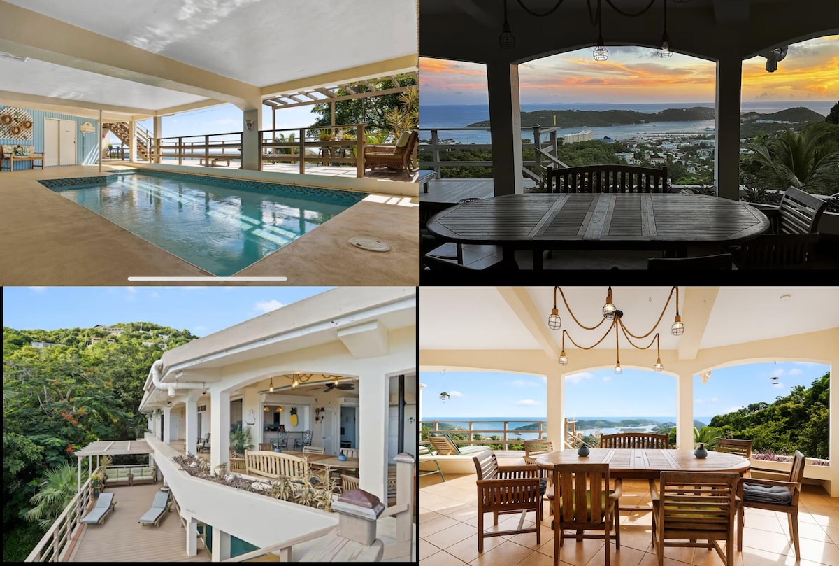 Escape to Sunrise Villas by Stacie, a private tropical mountaintop retreat in St. Thomas. Enjoy panoramic ocean views, a heated pool with Baja sun deck, jets, and lights, plus elegant indoor-outdoor living with 20-ft sliding doors, gourmet kitchen, bar, and fireplaces. With a whole-home generator, comfort is guaranteed. Perfect for couples, families, or friends—book the villa next door for up to 6 more guests.