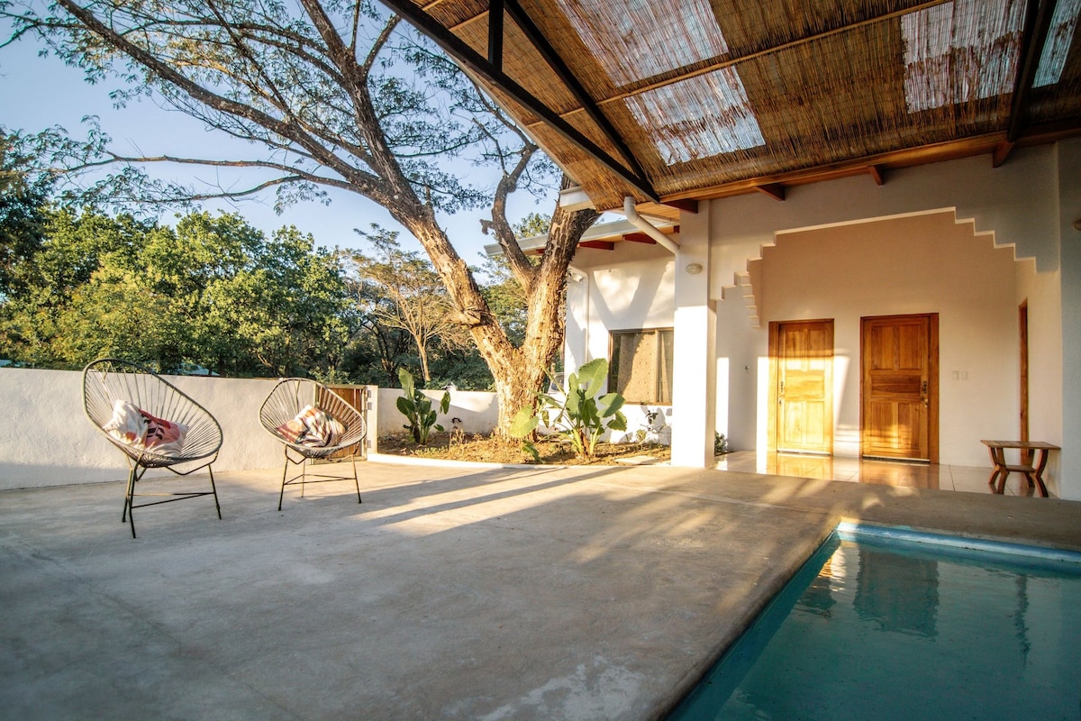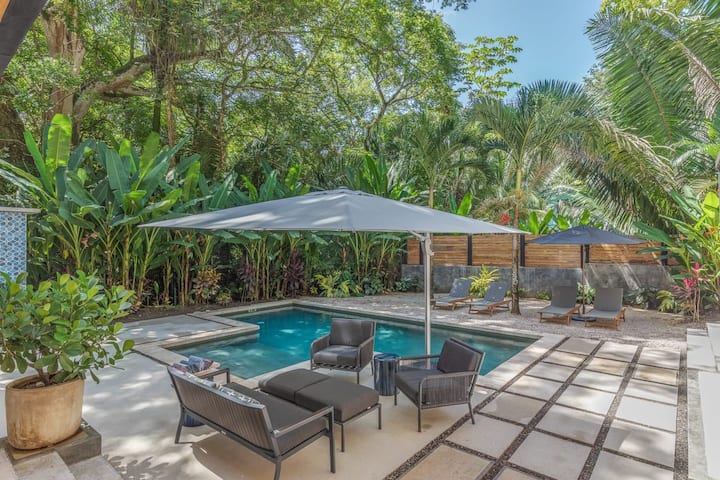 Casa privada tranquila na selva com 3 quartos/3 casas de banho e piscina, a uma curta distância a pé de duas praias de classe mundial. Desfrute de uma vida interior e exterior luminosa num local de observação da vida selvagem. Perfeito para famílias pequenas, casais ou viagens de surf e yoga, este oásis sereno oferece privacidade perto de praias, restaurantes e aventura. Recomenda-se um veículo 4x4 para explorar a área mais ampla de Nosara, especialmente durante as estações chuvosas. Adoramos a natureza, por isso espere partilhar o seu espaço com a vida selvagem local (e insetos!).