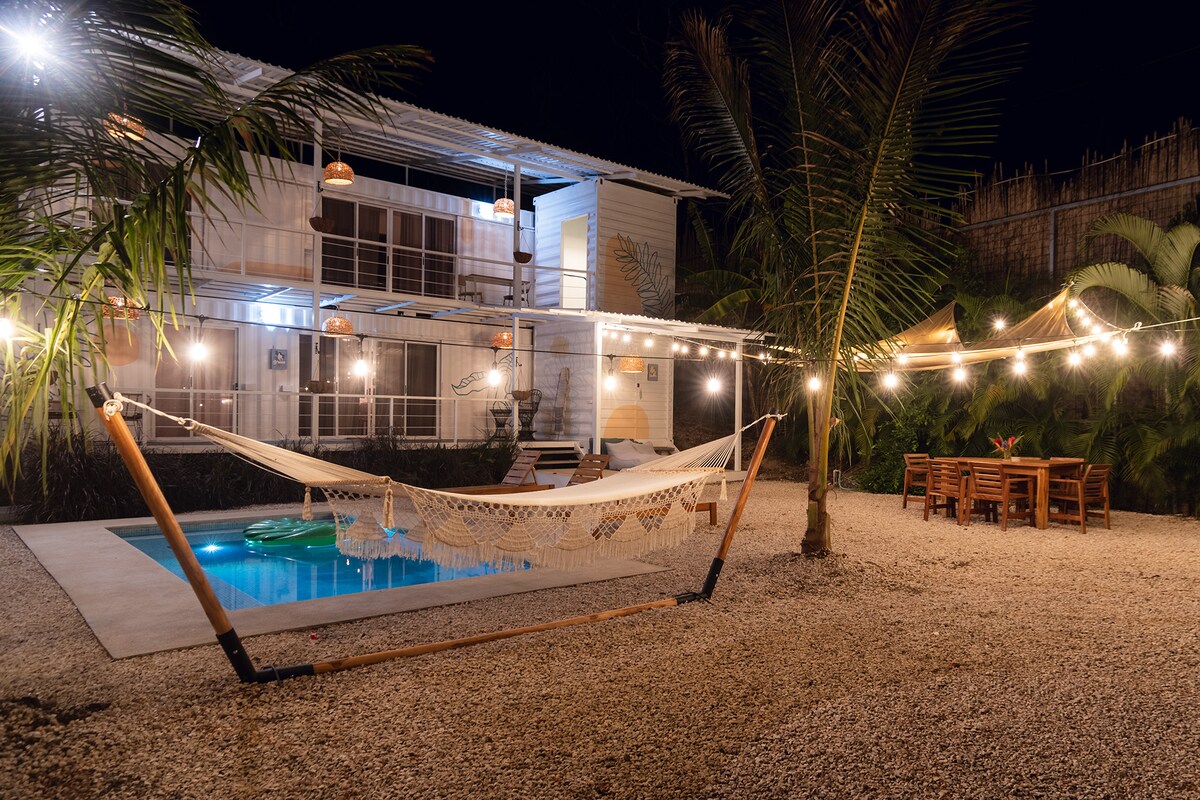 Casa-contêiner novinha em folha de 1 quarto em Nosara, a 4 minutos a pé da praia. Vista para a selva e piscina, cozinha completa e lavanderia. Este anúncio é novo, mas você pode verificar meus mais de 150 comentários de 5 estrelas como Superhost. Localizada no Club Marina com duas outras casas de contêineres, a Suíte La Mariposa tem uma cama king-size e um pátio. Está lá em cima, subindo uma escada em espiral. Boa segurança e Wi-Fi forte. Não aceitamos animais de estimação. Aceitamos crianças caso a caso. Saiba mais sobre o Club Marina online ou no IG @clubmarinacostarica.
