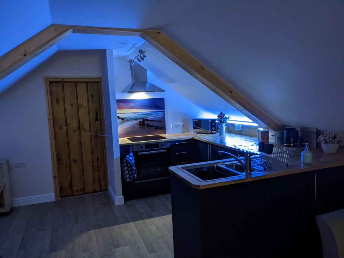 Um apartamento loft emoldurado em carvalho está acima de uma grande garagem que é acessada por escadas com uma varanda para sentar-se ao nível das árvores. O espaço não está anexado à nossa casa e tem acesso separado. O telhado inclinado dá ao apartamento uma sensação de espaço e luz, com aquecimento sob o piso. O espaço exterior é ideal se você quiser um pouco de ar fresco. Estamos em uma localização rural sem comodidades, embora a vila mais próxima fique a apenas três quilômetros de distância. Gostaríamos de receber todos os visitantes, mas não aceitamos crianças.