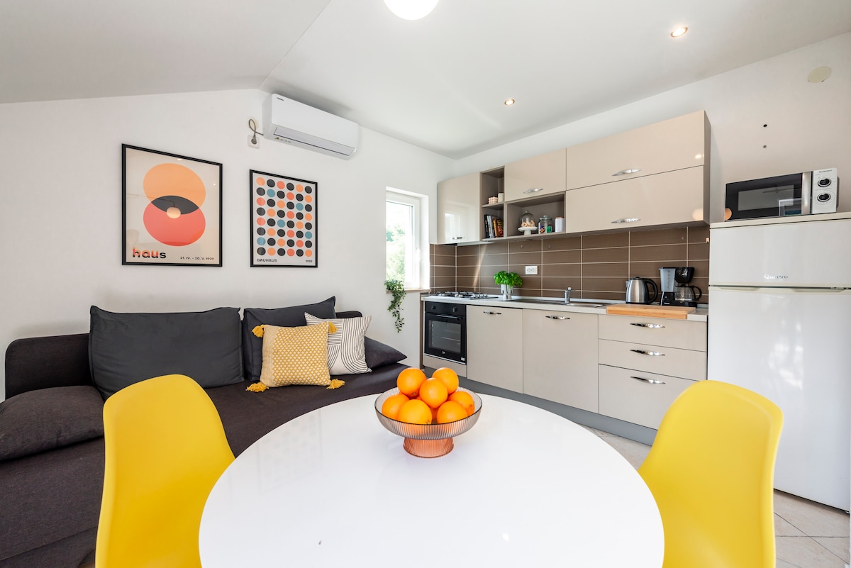 Apartamento Paula, totalmente equipado no 1º andar, entrada separada, jacuzzi ao ar livre, bicicletas disponíveis 24 horas por dia. Ideal para casais, família com filhos, grupos até 7 pessoas, estacionamento privativo. Cozinha, sala de estar, três quartos, dois banheiros com água de aquecimento solar, duas varandas fazem 100 m2 deste encantador lugar de estar. Wi-fi, TV SAT, ar-condicionado, acessórios de cozinha completos... Distância: restaurante -500 m, supermercado-200 m, Cidade Velha-9 km, aeroporto-20 km, estação de ônibus-150 m, praia-500 m.
