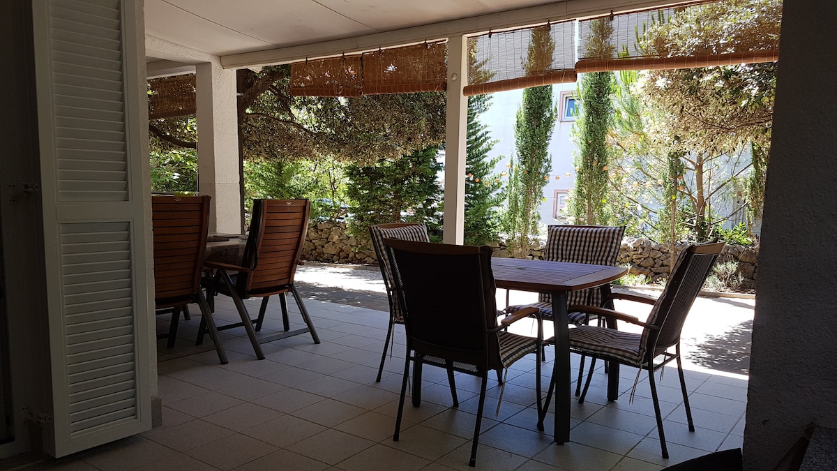 Beautiful 34m2 1 bedroom 1 living room ground floor with green courtyard 35m2 quiet environment Entrance to apartment from garden Apartment view on the seaside Kitchen with all appliances bathroom with shower wi-fi LCD TV Swimming pool open n1st of June to Oct 1st spectacular view sand beach 30m from the apartment access private stairs Clean sea water and beautiful nature and beaches Only for families with small kids and married couples Shaded parking spot secured Two AC+vent.+tent Two bikes.