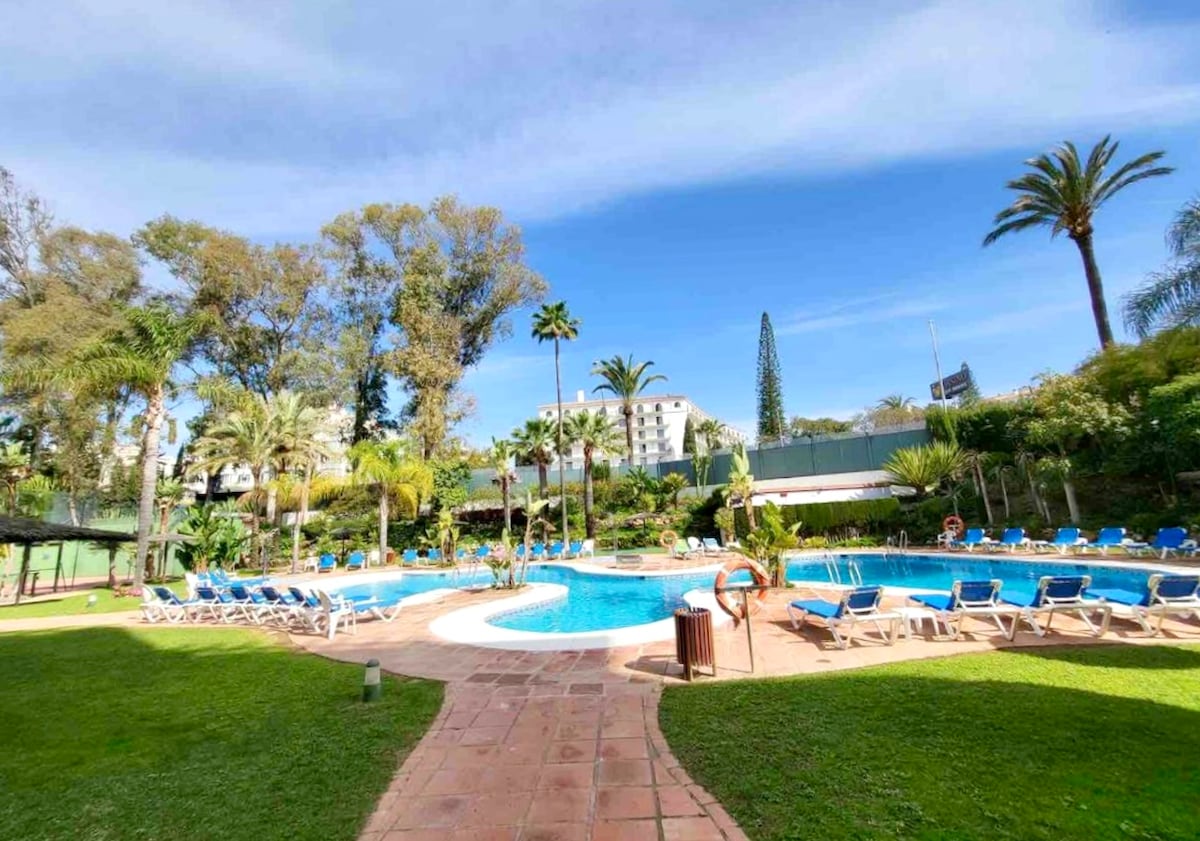 Apartamento encantador com jardim, localizado numa urbanização exclusiva no Las Lomas del Marbella Club, na Golden Mile, a zona mais exclusiva de Marbella. • A 2 km da Puente Romana e da praia • A 4 km de Puerto Banús • 3 piscinas • Terraço privado com 2 espreguiçadeiras • Pequeno ginásio • Campo de squash • Janelas grandes com muita luz natural • 1 quarto com cama king (180 x 200) • 1 quarto com 2 camas individuais (90×190) • Elevador • Lugar de estacionamento privado • Concierge 24h Perfeita como casa de férias ou para famílias.