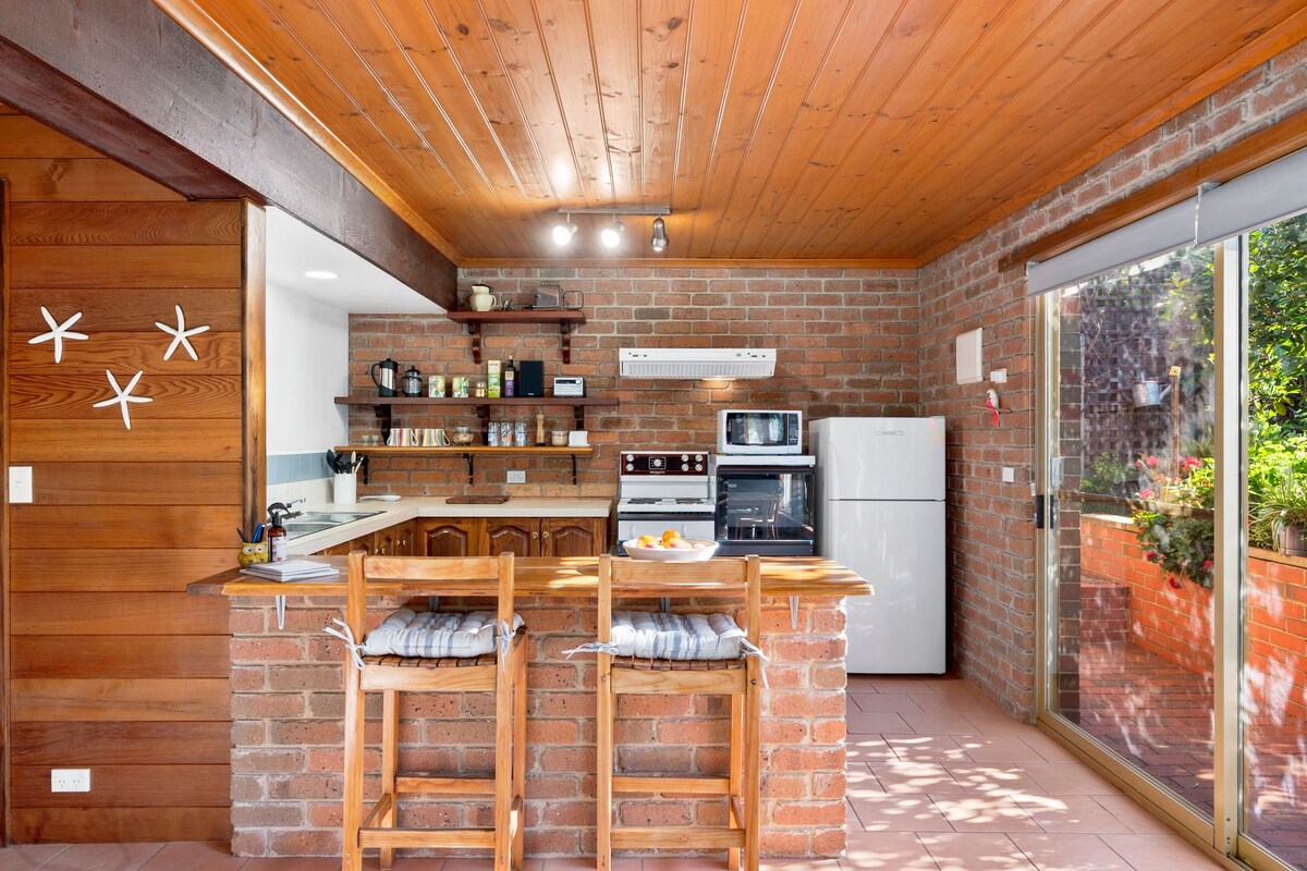 Vá à praia ou ao centro da cidade a 4 minutos de carro deste estúdio tranquilo e acolhedor. Ouça os pássaros cantando enquanto você acorda para a sua cesta de café da manhã fornecida na chegada. Os produtos de origem local incluem muesli Adelia, pão de fermentação natural, manteiga LardAss, água com gás, suco, leite e geleia. Relaxe a tarde em seu acolhedor lounge ou área externa com um vinho local que você pegou em suas aventuras. Em noites mais frias, desfrute do calor da sua lareira ao ar livre.