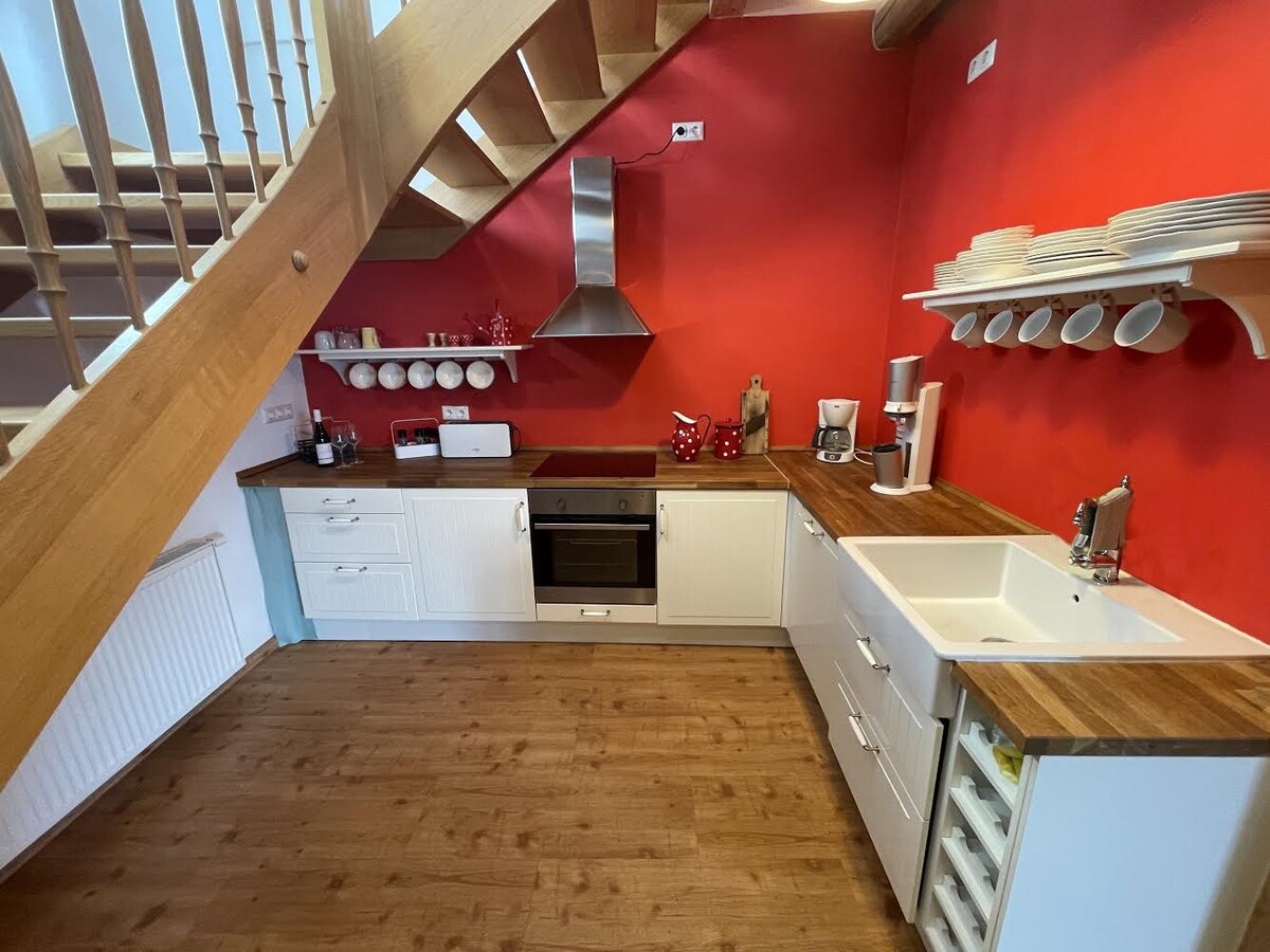 Experimente o Rheingau e fique no nosso espaçoso, celeiro de estilo loft com um pátio acolhedor (com estacionamento para o seu carro) no tradicional bairro de Johannisberg. O mundialmente famoso Castelo de Johannisberg fica a 250 m de distância e o trilho de caminhada de longa distância Rheinsteig passa a 400 m de distância. Várias adegas com tabernas ou tabernas de vinho estão a uma curta distância a pé.