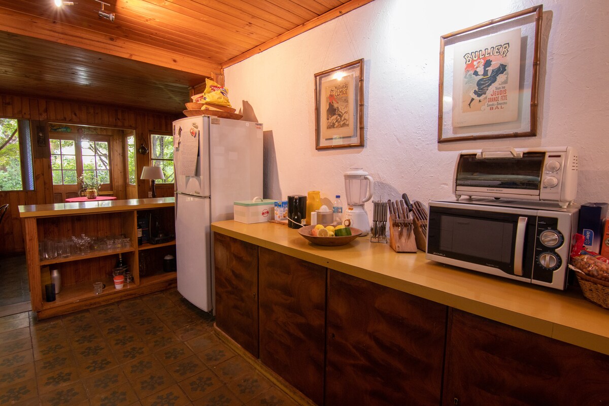 Casa de campo, com 2000 metros de jardim. A casa é feita de madeira e adobe, com grandes janelas que permitem a entrada de muita luz. O jardim é exuberante e natural; cada uma das plantas e árvores foram plantadas por nós quando construímos a casa. Se você está procurando tranquilidade, natureza e um bom descanso, este é o lugar.