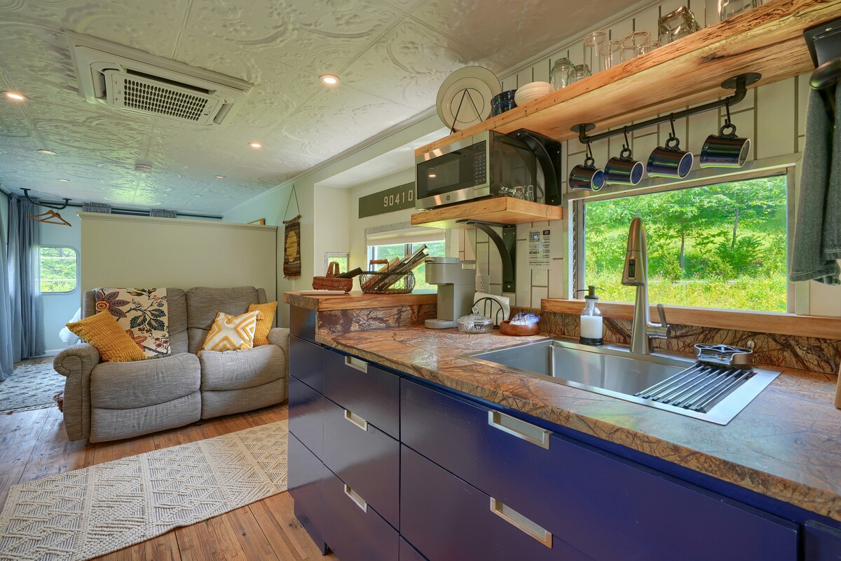 O Little Blue Caboose é a nossa joia de safira. Centenas de pequenos rebites azuis no seu exterior metálico sugerem os detalhes art déco no interior. Este comboio foi atualizado tanto em estilo como em conforto e atrai-o com a sua vista de corpo inteiro de uma ponta à outra. À medida que percorre o espaço de estar até ao espaço de jantar, os detalhes dourados antigos destacam este espaço confortável, enquanto os padrões divertidos o levam através dos quartos de dormir até ao chuveiro revestido de azulejos e à área de toucador. Todos a bordo!