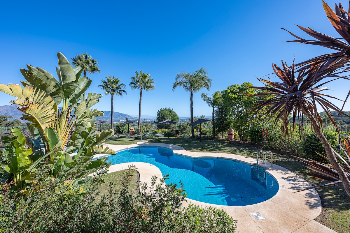 A Casa Calma é uma vila de estilo mediterrâneo elegante e muito bem equipada para famílias e golfistas em um terreno privado de mais de 1.000 m² com piscina privativa de água salgada e jardim exótico - é o nosso pequeno paraíso. A vila está localizada diretamente em Marbella, em uma colina cercada por outras vilas e oferece vista para o mar. A casa tem uma linha de Internet de fibra ótica de 100 MBit. De carro, você chega à praia em 5 minutos, à antiga cidade de Marbella em 10 minutos e ao Clube de Golfe Río Real em 5 minutos.