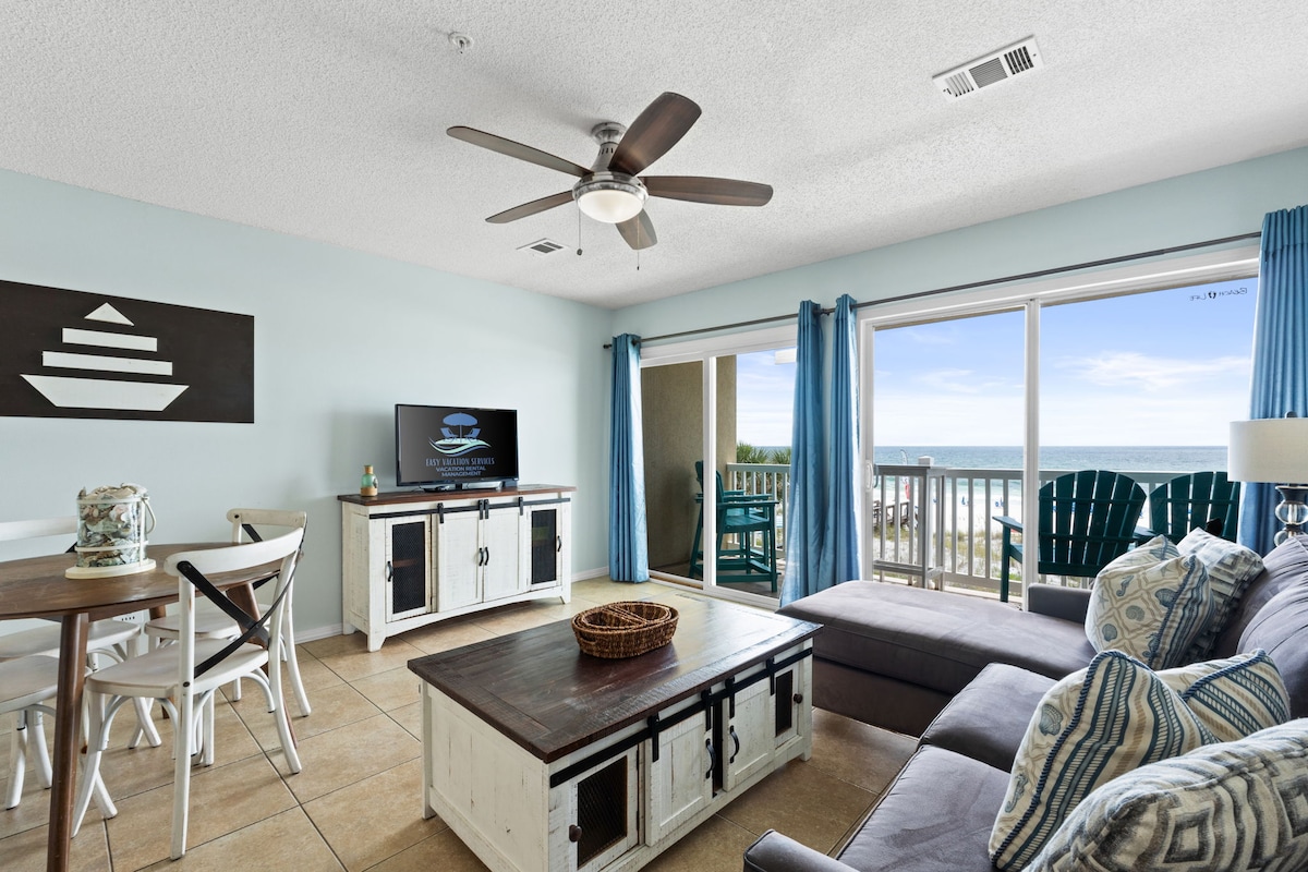 Desfrute das melhores vistas para o pátio e para o mar a partir deste condomínio 1BR no 5º andar, a unidade de 1 quarto mais próxima da praia no Waterscape Resort. O quarto principal tem uma cama king e uma casa de banho privativa. As crianças adoram os beliches com televisões. A unidade também inclui um sofá-cama, eletrodomésticos de aço inoxidável, máquina de lavar/secar roupa na unidade e cadeiras de praia com guarda-sol armazenado na unidade. Os hóspedes regressam ano após ano para ver a vista, o conforto e as comodidades do resort, como piscinas, cascata e rio preguiçoso.