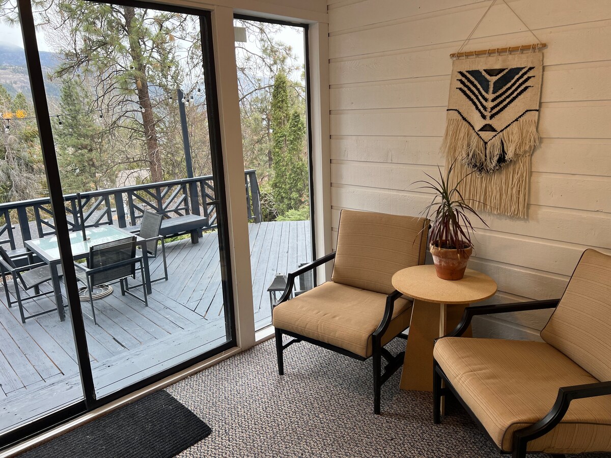 A relaxing retreat for couples, solos or business travelers. Above ground, private entry-self check in. Free parking. King bed, in suite laundry, Fast WIFI. Fully stocked kitchen- coffee, light grab and go breakfast included. Melt in the barrel sauna, then relax on a secluded, year-round sheltered patio with a fire table, cozy seating and barbeque all in a quiet, fenced back yard. 5 minutes from Highway 1, 10 minutes to downtown, 55 minutes to Sun Peaks. The perfect base for your next getaway.