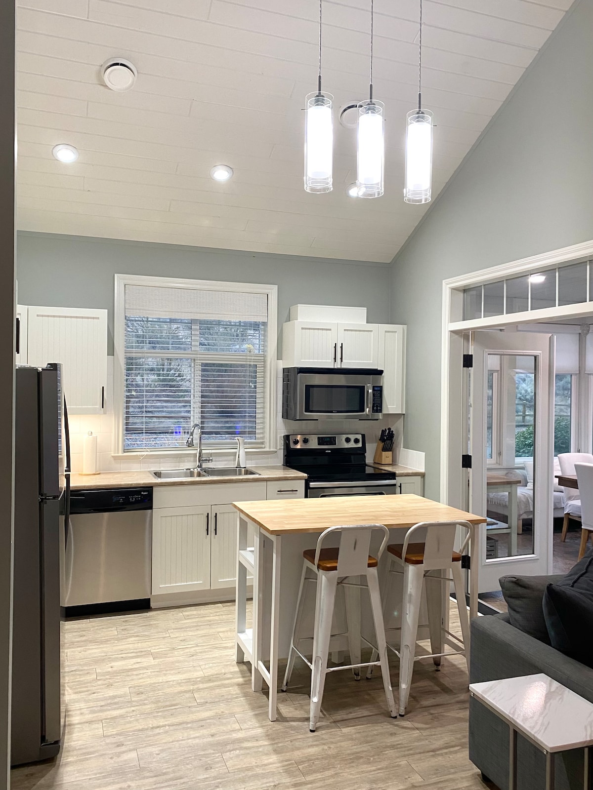 Casa de carruagens privativa, independente, 2 quartos, 2 banheiros que acomoda 6 pessoas confortavelmente. Um design de conceito aberto que apresenta tetos abobadados, piso de tábuas de vinil e uma generosa área de estar/jantar. Quarto principal com portas de correr que levam a um deck traseiro privativo, banheiro principal espaçoso com banheira/chuveiro, lavanderia na suíte, banheiro adicional de 2 peças. Envolva-se em torno da varanda coberta, área de gramado e privacidade proporcionada por cedros de cobertura. Ar condicionado central e estacionamento para 3 veículos. Animais de estimação são bem-vindos.