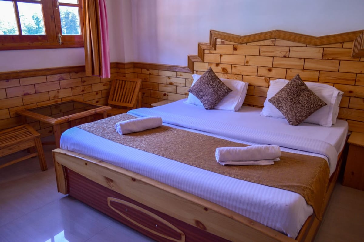 Designed for families and small groups, our spacious Family Room blends modern comfort with warm mountain aesthetics. The room features a plush king-size bed and an additional sleeping area, making it ideal for parents traveling with children or friends staying together. Room Highlights: • King-size bed + extra sleeping space • Spacious layout with wooden interiors • Cozy seating area • Large windows with peaceful views • Flat-screen TV & wardrobe • Clean, modern attached bathroom