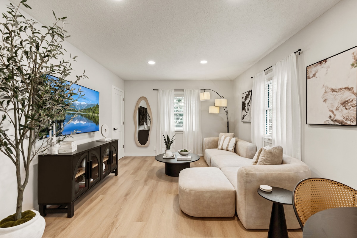 Welcome to The Luxury Haus, your chic, curated escape for those who crave the best. This stylish second-floor apartment offers 2BR, 1BA, and is thoughtfully layered with luxury linens, designer lighting, plush beds, and Smart TVs in every room. Sip something delicious from the stocked coffee bar, cook in a fully equipped kitchen, and snuggle into dreamy blankets. Includes washer/dryer, garage parking, and elevated comfort throughout. We also have a small patio area with two chairs and a table.