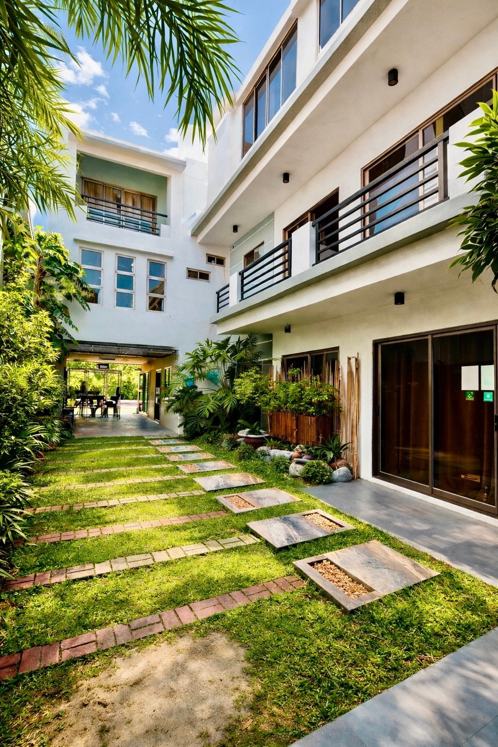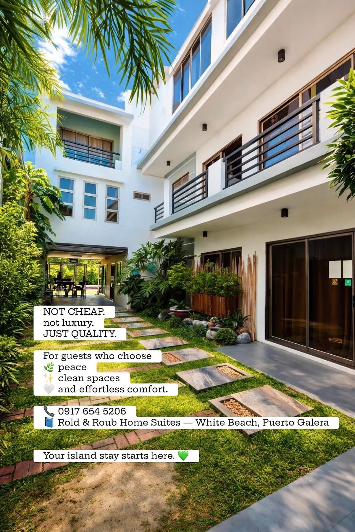 A Casa Branca junto à rua é um pequeno edifício de três andares. No primeiro andar há uma padaria que serve hambúrguer de qualidade, que já dura mais de 6 anos. Três quartos privados para alugar estão no segundo andar e é muito novo. Muito acessível a transportes públicos. Há uma pequena varanda ao lado. Fica a mais ou menos 10 minutos a pé da praia e a poucos passos da capela,supermercado, mercado molhado e lojas de lembranças. É adequado para casais, famílias e grupo/barkada.