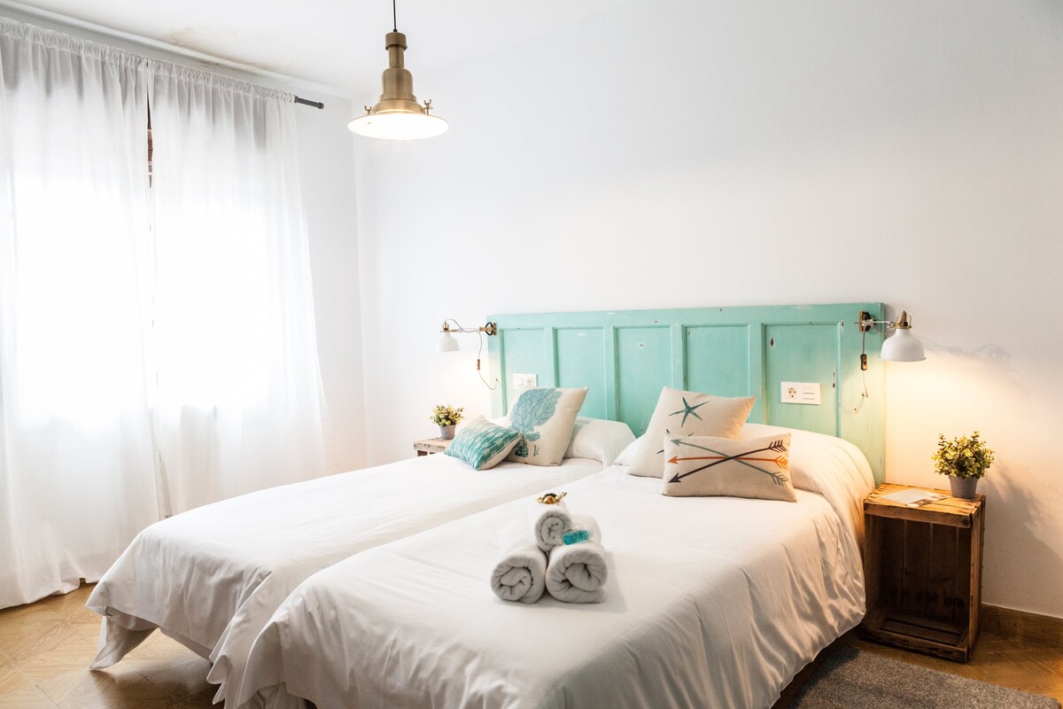 Quarto privado em Casa 'Ohana com cama de casal e casa de banho privativa. Jardim, terraço e sala de jantar partilhados. Localizado nas colinas verdes da Cantábria, perto de Comillas, Playa Oyambre e San Vicente de la Barquera.
