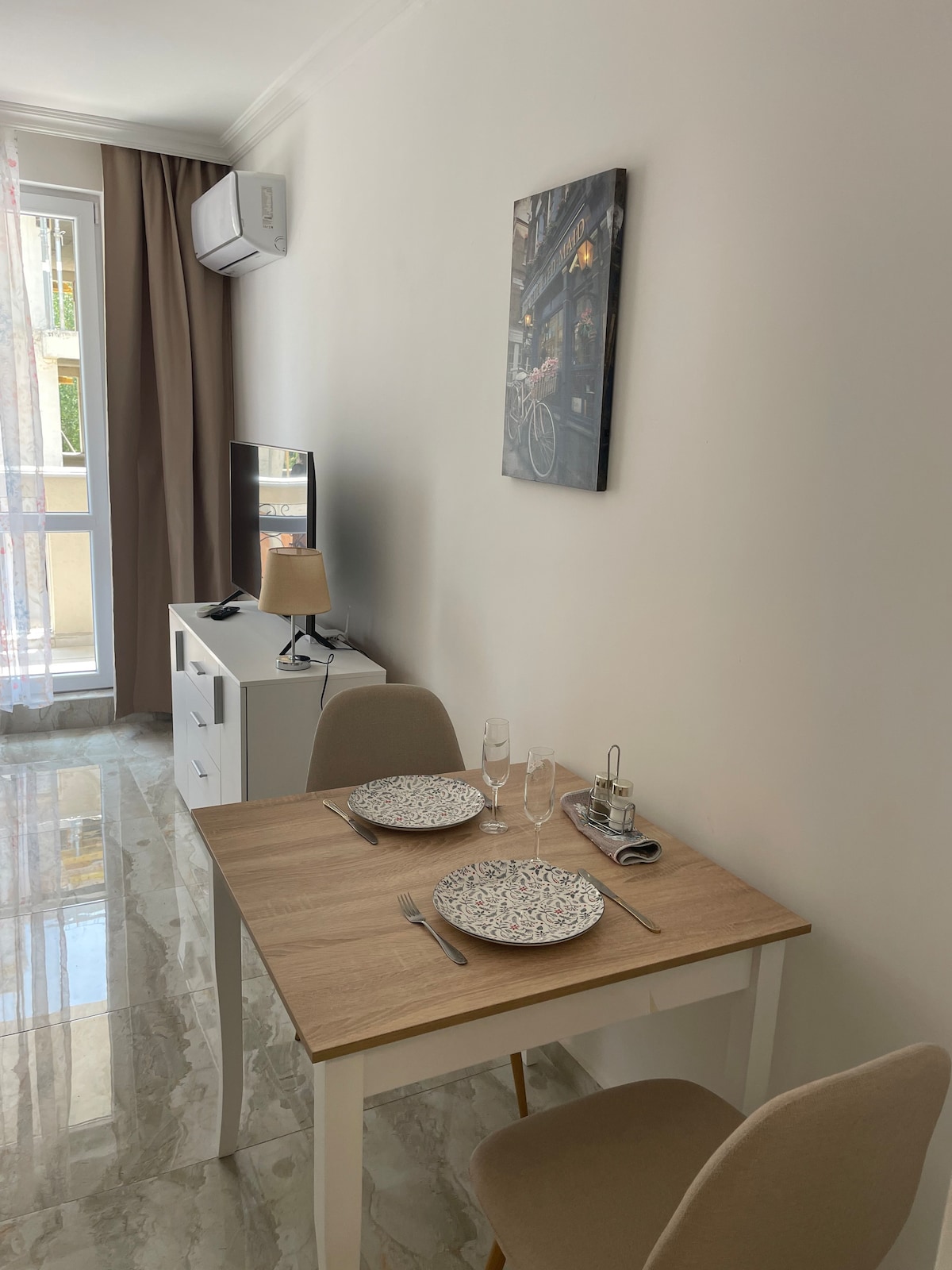 Um novo apartamento estúdio elegante no moderno complexo Sorrento Sole Mare com uma piscina e um parque infantil: • Apenas 200 metros do mar. • Supermercado a 3 minutos a pé • Restaurantes, cafés e ginásio a 5 minutos. O apartamento é novo: Cama de casal confortável. Roupeiro e cómoda. Varanda espaçosa com mobiliário. Tudo o que precisa para uma estadia confortável é fornecido! Se tiver alguma dúvida ou as datas desejadas não estiverem disponíveis, não hesite em enviar-me uma mensagem. Bem-vindo!