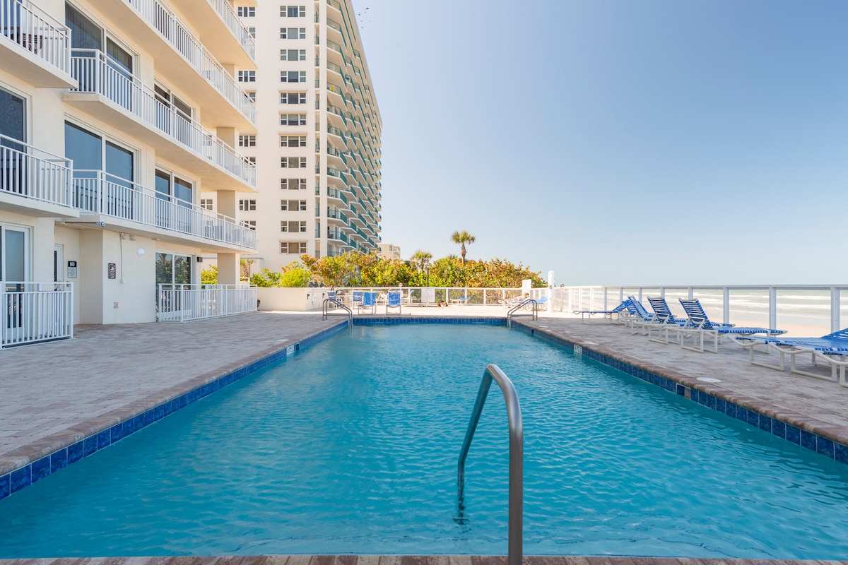 Ormond Beach é o refúgio de praia perfeito para casais, famílias e amigos! Venha desfrutar do nosso espaçoso apartamento de 2 camas/ 2 casas de banho com vistas incríveis para o mar de quase todos os quartos e acesso direto à praia. Desfrute de uma chávena de café enquanto observa o nascer do sol na varanda ou um copo de vinho durante o pôr-do-sol. O condomínio é confortável e perfeito para até 4 pessoas. O quarto 1 tem uma cama king e o quarto 2 tem uma cama queen e uma cama de solteiro. Além disso, o edifício do condomínio tem uma piscina aquecida sazonalmente. Venha relaxar e aproveitar!