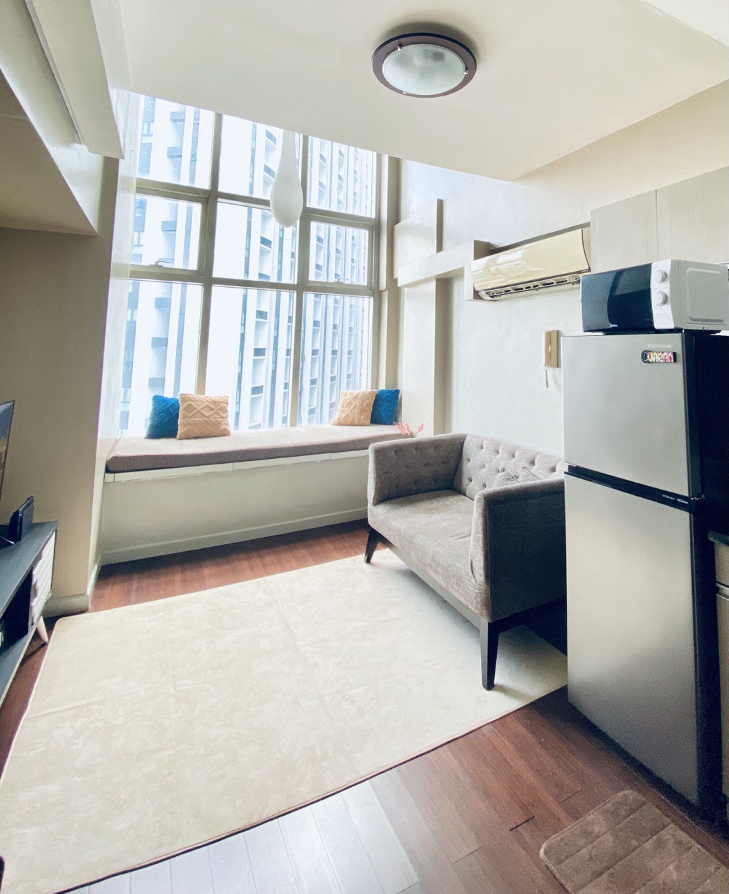 Bem-vindo ao CIRQ Studio no Eton Emerald Lofts. Esta nova unidade de condomínio tipo loft de 40 m² está situada no coração do Distrito Comercial de Ortigas e fica a apenas 4 minutos a pé da Robinsons Galleria. O tema principal e a inspiração deste apartamento é o Japandi Modern hotel-luxe estilizado com móveis e decorações modernas de meados do século. Tons neutros com uma combinação de texturas de madeira escura com detalhes em azul titânio e acessórios dourados tornando cada canto do apartamento pronto para o Insta-gram. :)