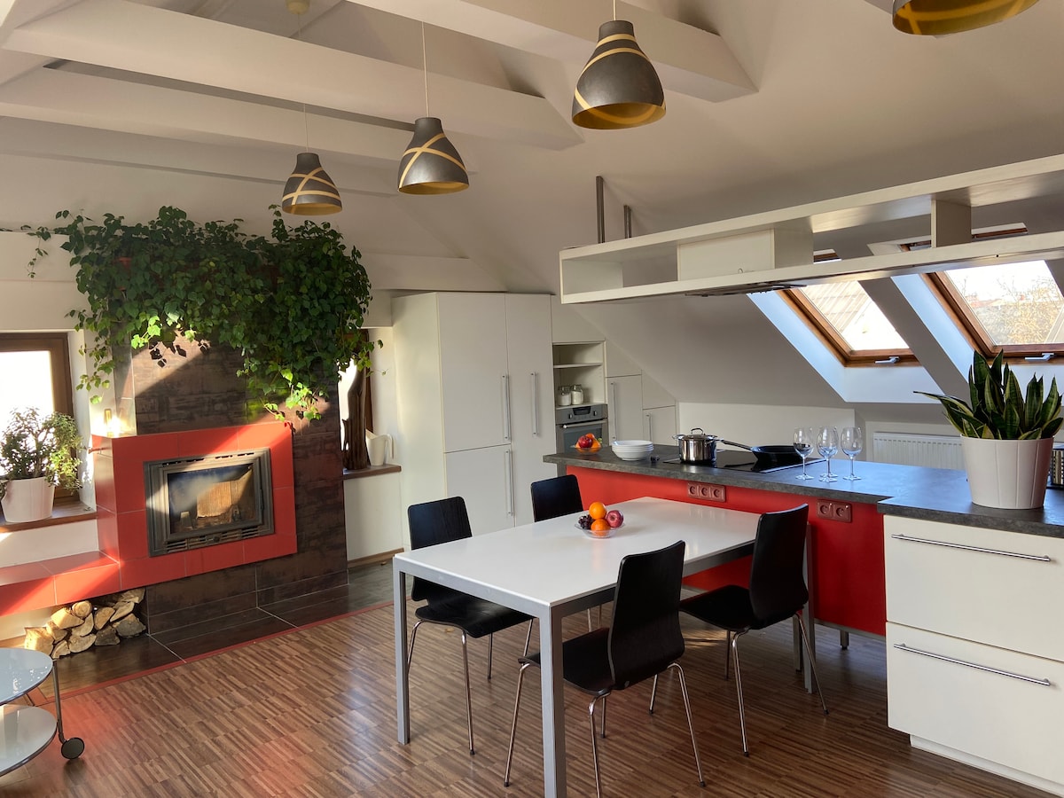 Apartamento no sótão com estacionamento gratuito perto do centro da cidade