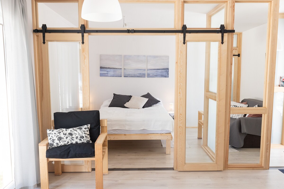 Um lugar para relaxar e trabalhar. É uma escrivaninha e uma boa internet. Esta é uma nova casa de campo muito quente durante todo o ano de 45 m2 com lareira e equipamento completo, uma geladeira grande,uma placa de indução completa, um forno, uma máquina de lavar louça e uma moderna máquina de lavar roupa. Um quarto confortável com uma cama de 160 x 200 cm e um sofá cama na sala para 2 pessoas. Banheiro com chuveiro com espelhos nas paredes e janela. Lindos lençóis + toalhas de casal para cada pessoa. Dois pais com dois filhos são a escolha ideal.