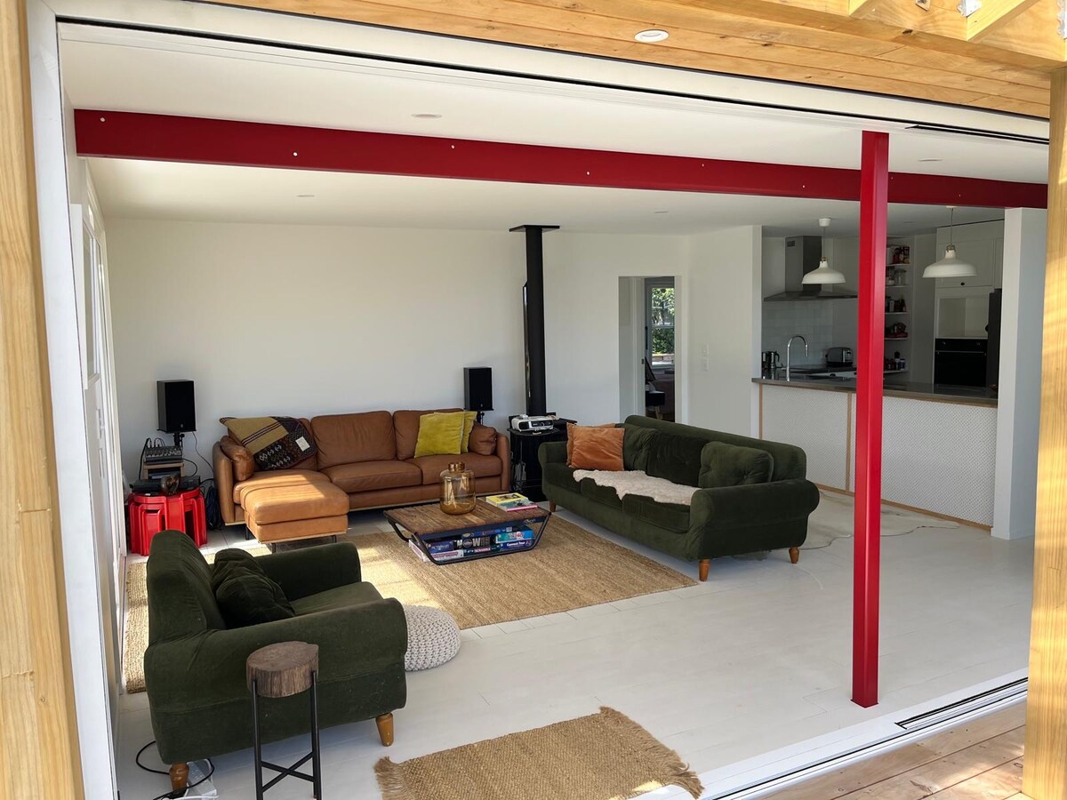 Ensolarada, espaçosa e acolhedora, com cores vibrantes por dentro e por fora, a Sunset Beach House tem uma mistura de móveis vintage e modernos, e tudo o que você poderia desejar, para umas férias ou uma escapada na bela praia de Otaki. Totalmente equipada com quatro quartos espaçosos em uma seção de um quarto de acre, há muito espaço para se espalhar e relaxar. Uma casa para todas as estações, desfrute de caminhadas tranquilas na praia, sol, surf e areia no verão, ou aconchegue-se perto do fogo no inverno e aproveite a neve nas belas Tararuas.